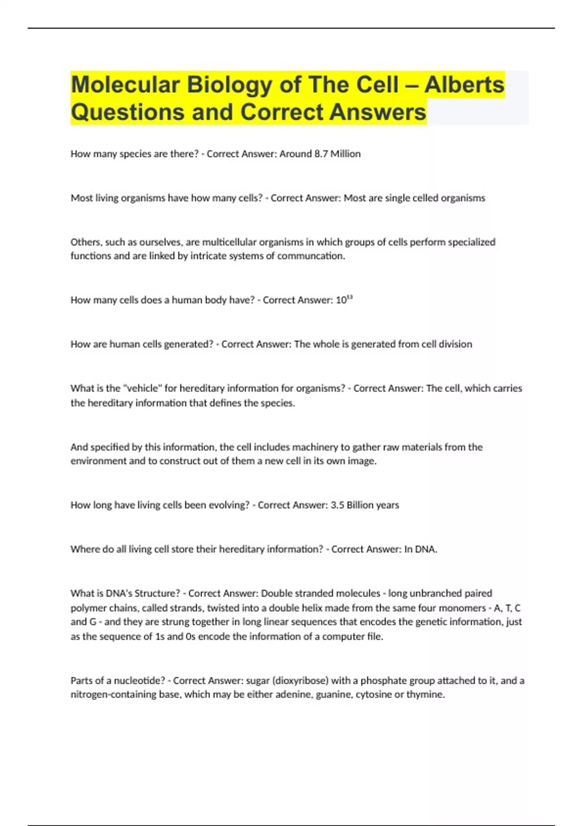 Molecular Biology of The Cell – Alberts Questions and Correct Answers.
