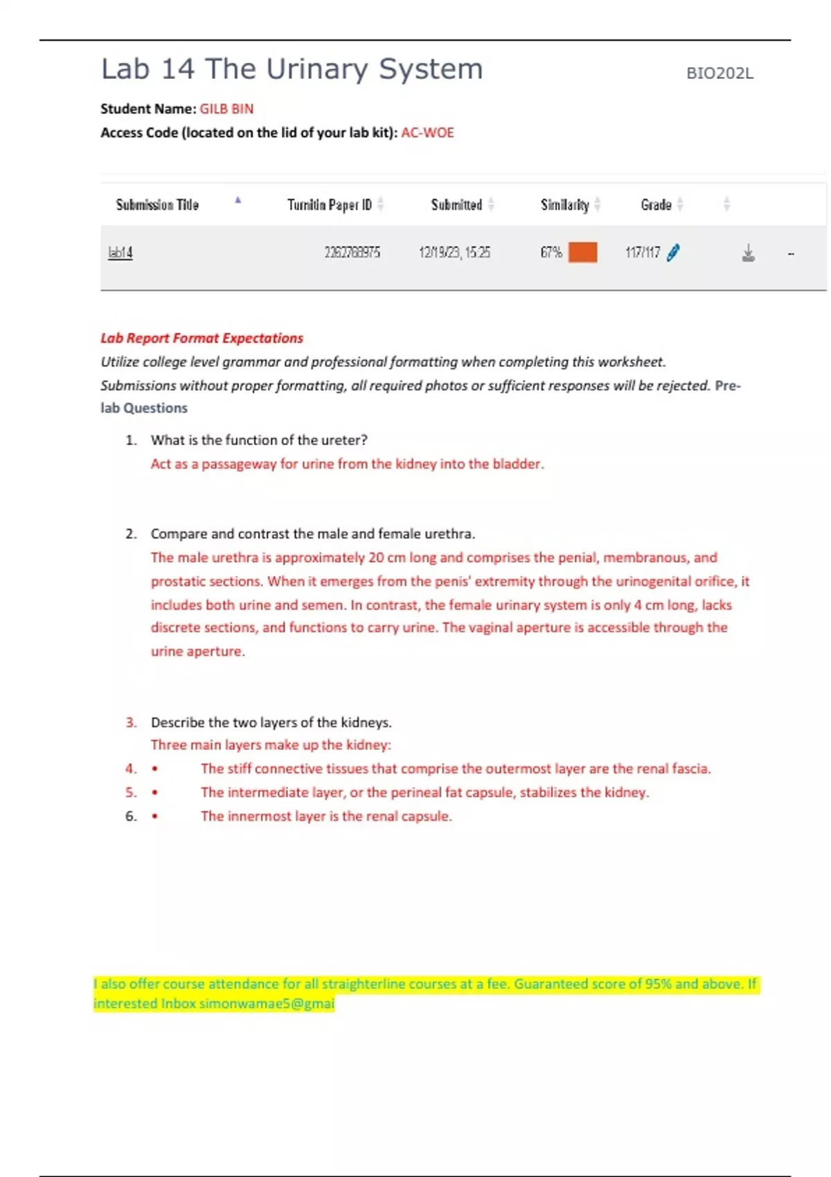 Lab 14 The Urinary System BIO202L I also offer course attendance for all straighterline courses at a fee. Guaranteed score of 95% and above. If interested Inbox simonwamae5@gmai Student Name: GILB BIN Access Code (located on the lid of your lab kit): AC-