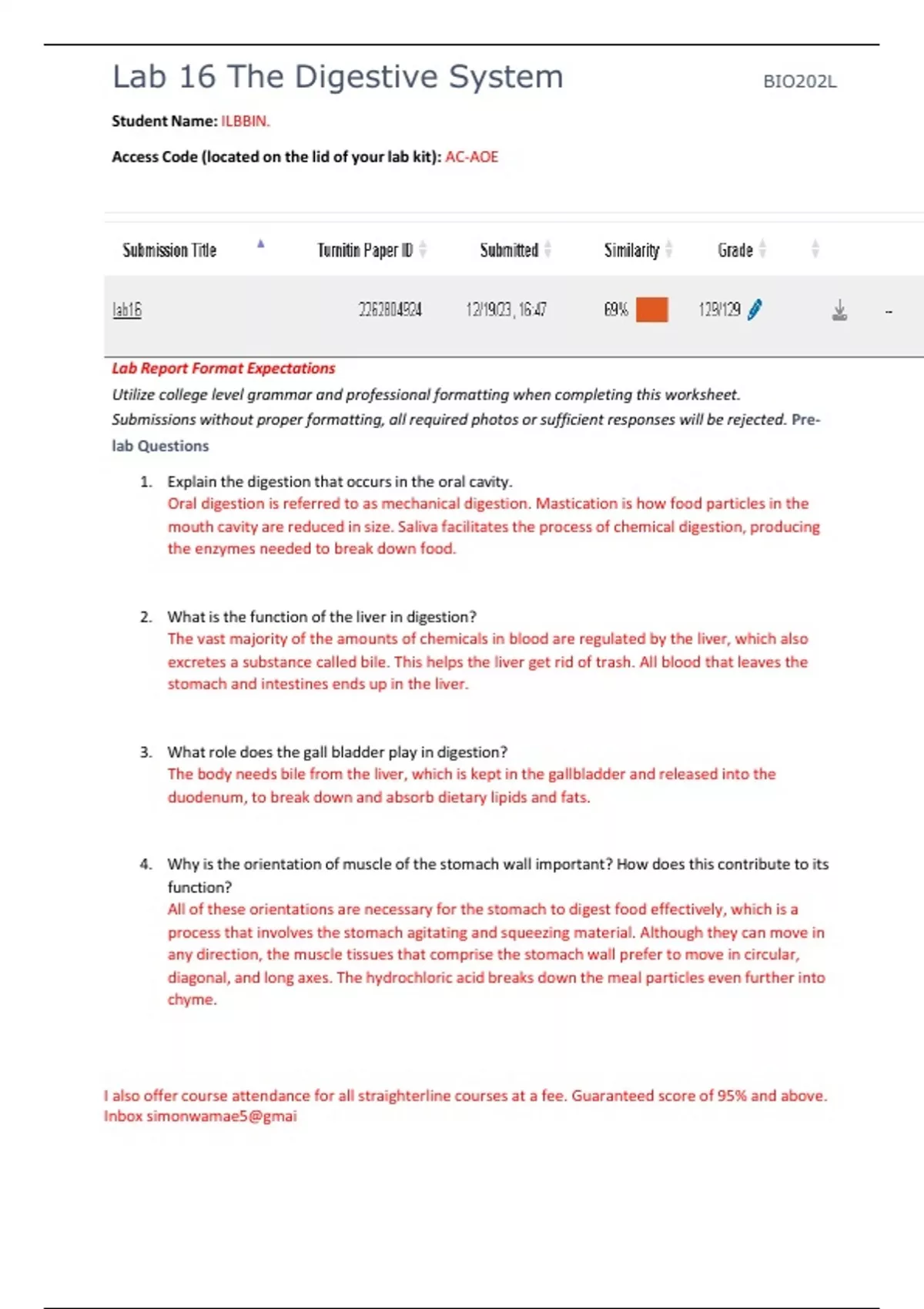 Lab 16 The Digestive System BIO202L I also offer course attendance for all straighterline courses at a fee. Guaranteed score of 95% and above. Inbox simonwamae5@gmai Student Name: ILBBIN. Access Code (located on the lid of your lab kit): AC-AOE Lab Repor