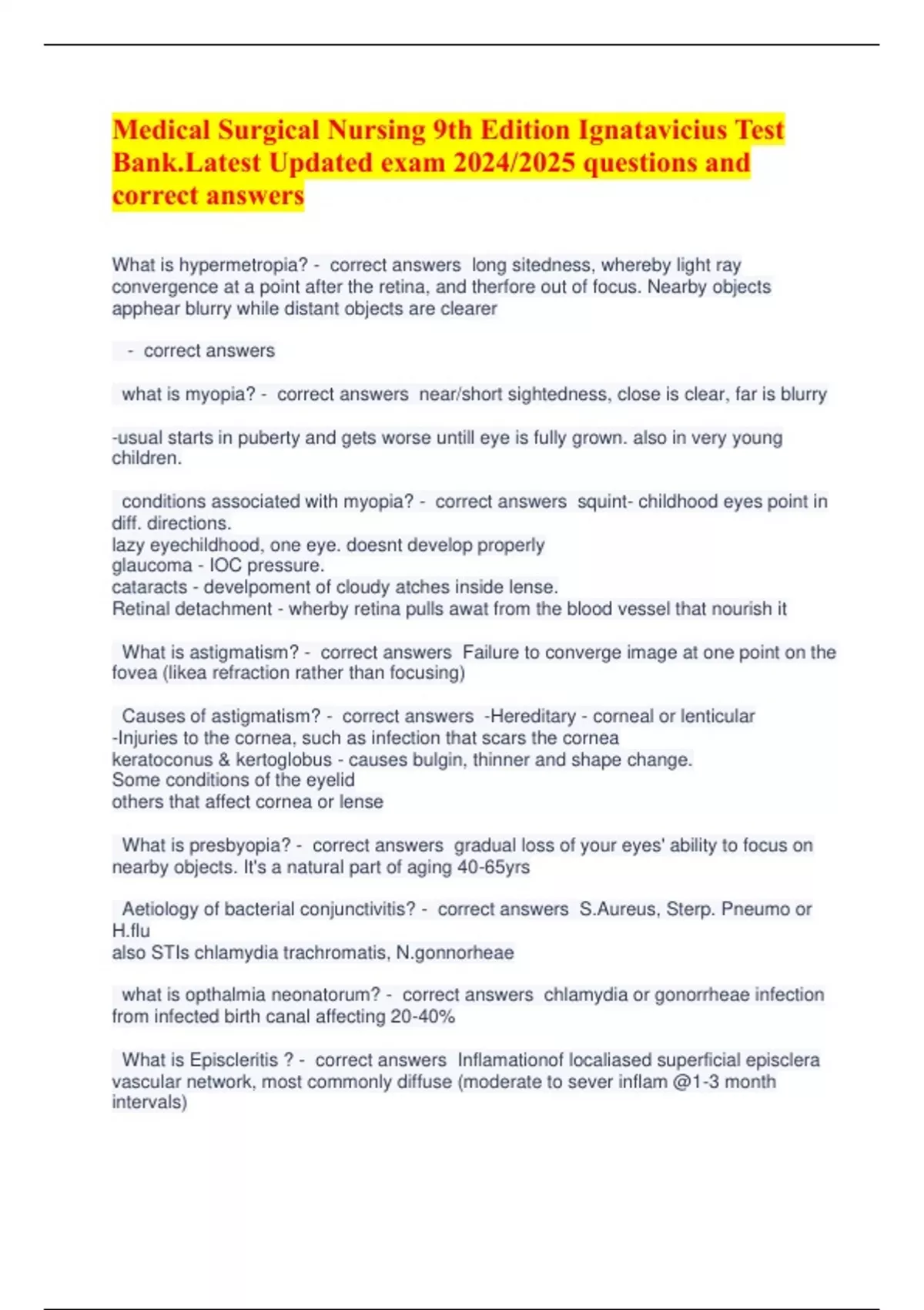 Medical Surgical Nursing 9th Edition Ignatavicius Test Bank.Latest Updated exam 2024/2025 questions and correct answers What is hypermetropia? - correct answers long sitedness, whereby light ray convergence at a point after the retina, and therfore out of focus. Nearby objects apphear blurry while distant objects are clearer - correct answers what is myopia? - correct answers near/short sightedness, close is clear, far is blurry -usual starts in puberty and gets worse untill eye is fully grown. also in very young children. conditions associated with myopia? - correct answers squint- childhood eyes point in diff. directions. lazy eyechildhood, one eye. doesnt develop properly glaucoma - IOC pressure. cataracts - develpoment of cloudy atches inside lense. Retinal detachment - wherby retina pulls awat from the blood vessel that nourish it What is astigmatism? - correct answers Failure to converge image at one point on the fovea (likea refraction rather than focusing) Causes of astigmatism? - correct answers -Hereditary - corneal or lenticular -Injuries to the cornea, such as infection that scars the cornea keratoconus & kertoglobus - causes bulgin, thinner and shape change. Some conditions of the eyelid others that affect cornea or lense What is presbyopia? - correct answers gradual loss of your eyes' ability to focus on nearby objects. It's a natural part of aging 40-65yrs Aetiology of bacterial conjunctivitis? - correct answers S.Aureus, Sterp. Pneumo or H.flu also STIs chlamydia trachromatis, N.gonnorheae what is opthalmia neonatorum? - correct answers chlamydia or gonorrheae infection from infected birth canal affecting 20-40% What is Episcleritis ? - correct answers Inflamationof localiased superficial episclera vascular network, most commonly diffuse (moderate to sever inflam @1-3 month intervals) -Nodular/focal episcleritis (can often present with associated systemic disease) What are the classification of Allergic conjunctivitis? - correct answers type 1 hypersensitivity - seasonal (SAC) perrenial - chronic (PAC) Atopic - relates to eczema and athsma gaint pappilary (GPC) Limbal and tarsal kertaoconjuctivitis (VKC) What is gaint pappilary Allergica conjunctivitis - correct answers inner lining of the eyelid swells and develops small bumps. Known as papillae, these bumps tend to form after chronic irritation what can cause a corneal abbration? - correct answers Direct trauma Foreign body between eyelid and conjunctiva Heat by contact UV radiation (Arc Eye) What can cause corneal ulcer? - correct answers can be secondary to abrasive trauma, pentrating injuries or prolonged use of contact lenses What are dendritic ulcers? - correct answers Herpes simplex virus (HSV) keratitis is the most frequent cause of corneal blindness. - aggressive treatment - Symptoms of Dendritic ulcers? - correct answers Pain Photophobia Blurred vision Tearing Redness - with fluorescein staining and has a delicate branching pattern, Appearance of dendritic ulcer on opthalmoscopy? - correct answers - infectious epithelial keratitis (with characteristic dendritic ulcers) -neurotrophic keratopathy -stromal keratitis endotheliitis (classified as disciform, diffuse, or linear) what are the symptoms of keratic precipitates and anterior uveitis - correct answers Pain, generally developing over a few hours or days except in cases of trauma: Redness Photophobia Blurred vision Increased lacrimation Chronic anterior uveitis presents primarily as blurred vision and mild redness. pain & photophobia normaly only during acute episode