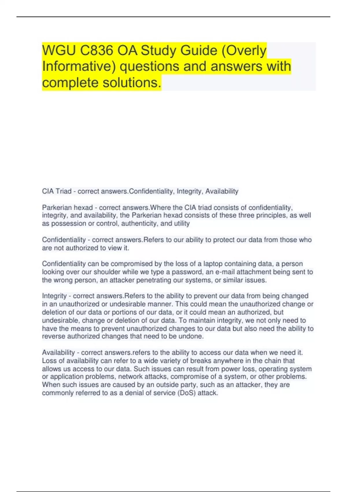 WGU C836 OA Study Guide (Overly Informative) questions and answers with complete solutions. CIA Triad - correct answers.Confidentiality, Integrity, Availability Parkerian hexad - correct answers.Where the CIA triad consists of confidentiality, integrity, and availability, the Parkerian hexad consists of these three principles, as well as possession or control, authenticity, and utility Confidentiality - correct answers.Refers to our ability to protect our data from those who are not authorized to view it. Confidentiality can be compromised by the loss of a laptop containing data, a person looking over our shoulder while we type a password, an e-mail attachment being sent to the wrong person, an attacker penetrating our systems, or similar issues. Integrity - correct answers.Refers to the ability to prevent our data from being changed in an unauthorized or undesirable manner. This could mean the unauthorized change or deletion of our data or portions of our data, or it could mean an authorized, but undesirable, change or deletion of our data. To maintain integrity, we not only need to have the means to prevent unauthorized changes to our data but also need the ability to reverse authorized changes that need to be undone. Availability - correct s to the ability to access our data when we need it. Loss of availability can refer to a wide variety of breaks anywhere in the chain that allows us access to our data. Such issues can result from power loss, operating system or application problems, network attacks, compromise of a system, or other problems. When such issues are caused by an outside party, such as an attacker, they are commonly referred to as a denial of service (DoS) attack. Possession or Control - correct answers.Refers to the physical disposition of the media on which the data is stored. This enables us, without involving other factors such as availability, to discuss our loss of the data in its physical medium An example is data store be on multiple devices and there could be numerous versions. Authenticity - correct answers.Attribution as to the owner or creator of the data in question. Authenticity can be enforced through the use of digital signatures. Utility - correct answers.Refers to how useful the data is to us. Interception - correct answers.Interception attacks allow unauthorized users to access our data, applications, or environments and are primarily an attack against confidentiality. Interception might take the form of unauthorized file viewing or copying, eavesdropping on phone conversations, or reading e-mail, and can be conducted against data at rest or in motion. Properly executed, interception attacks can be very difficult to detect. Affects Confidentiality Interruption - correct answers.Interruption attacks cause our assets to become unusable or unavailable for our use, on a temporary or permanent basis. Interruption attacks often affect availability but can be an attack on integrity as well. In the case of a DoS attack on a mail server, we would classify this as an availability attack. Affects Integrity and availability Modification - correct answers.Modification attacks involve tampering with our asset. If we access a file in an unauthorized manner and alter the data it contains, we have affected the integrity of the data contained in the file. Fabrication - correct answers.Fabrication attacks involve generating data, processes, communications, or other similar activities with a system. Fabrication attacks primarily affect integrity but could be considered an availability attack as well. If we generate spurious information in a database, this would be considered to be a fabrication attack. Affects Integrity and Availability Threat - correct answers.Something that has potential to cause harm Vulnerability - correct answers.Weaknesses that can be used to harm us Risk - correct answers.Likeliness that something bad will happen Impact - correct answers.The value of the asset is used to assess if a risk is present Something you know - correct answers.Password or PIN Something you are - correct answers.An authentication factor using biometrics, such as a fingerprint scanner. Something you have - correct answers.Authentication factor that relies on possession (FOB, Card, Cell Phone, Key) Something you do - correct answers.An authentication factor indicating action, such as gestures on a touch screen. Multifactor Authentication - correct answers.Uses one or more authentication methods for access Mutual Authentication - correct answers.A security mechanism that requires that each party in a communication verify its identity. Can be combine with multifactor authentication. In mutual authentication, not only does the client authenticate to the server, but the server authenticates to the client as well. Mutual authentication is often implemented through the use of digital certificates. Both the client and the server would have a certificate to authenticate the other. Biometric: Universality - correct answers.Characteristics in the majority of people we expect to enroll for the system. Biometric: Uniqueness - correct answers.Measure of how unique a particular characteristic is among individuals Biometric: Permanence - correct answers.How well a particular characteristic resists change over time and with advancing age. Biometric: Collectability - correct answers.How easy it is to acquire a characteristic with which we can later authenticate a user Biometric: Performance - correct answers.Set of metrics that judge how well a given system functions. Such factors include speed, accuracy, and error rate Biometric: Acceptability - correct answers.A measure of how acceptable the particular characteristic is to the users of the system Biometric: Circumvention - correct answers.Describes the ease with which a system can be tricked by a falsified biometric identifier.