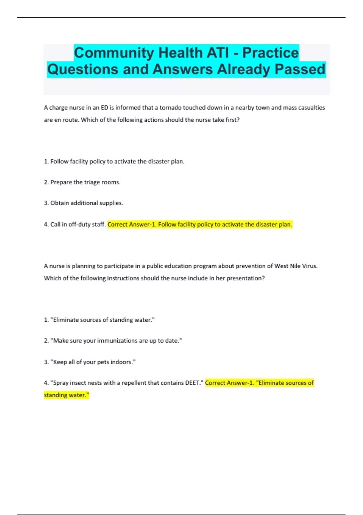 A charge nurse in an ED is informed that a tornado touched down in a nearby town and mass casualties are en route. Which of the following actions should the nurse take first? 1. Follow facility policy to activate the disaster plan. 2. Prepare the triage rooms. 3. Obtain additional supplies. 4. Call in off-duty staff. Correct Answer-1. Follow facility policy to activate the disaster plan. A nurse is planning to participate in a public education program about prevention of West Nile Virus. Which of the following instructions should the nurse include in her presentation? 1. "Eliminate sources of standing water." 2. "Make sure your immunizations are up to date." 3. "Keep all of your pets indoors." 4. "Spray insect nests with a repellent that contains DEET." Correct Answer-1. "Eliminate sources of standing water."