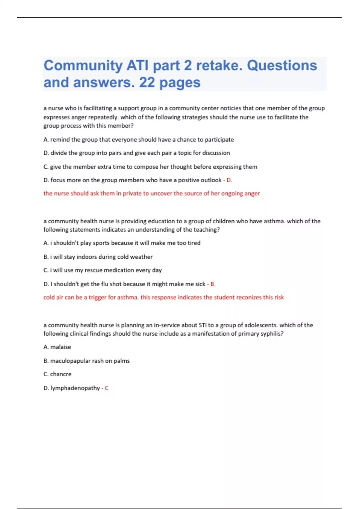 a nurse who is facilitating a support group in a community center noticies that one member of the group expresses anger repeatedly. which of the following strategies should the nurse use to facilitate the group process with this member? A. remind the group that everyone should have a chance to participate D. divide the group into pairs and give each pair a topic for discussion C. give the member extra time to compose her thought before expressing them D. focus more on the group members who have a positive outlook - D. the nurse should ask them in private to uncover the source of her ongoing anger a community health nurse is providing education to a group of children who have asthma. which of the following statements indicates an understanding of the teaching? A. i shouldn't play sports because it will make me too tired B. i will stay indoors during cold weather C. i will use my rescue medication every day D. I shouldn't get the flu shot because it might make me sick - B. cold air can be a trigger for asthma. this response indicates the student reconizes this risk a community health nurse is planning an in-service about STI to a group of adolescents. which of the following clinical findings should the nurse include as a manifestation of primary syphilis? A. malaise B. maculopapular rash on palms C. chancre D. lymphadenopathy - C