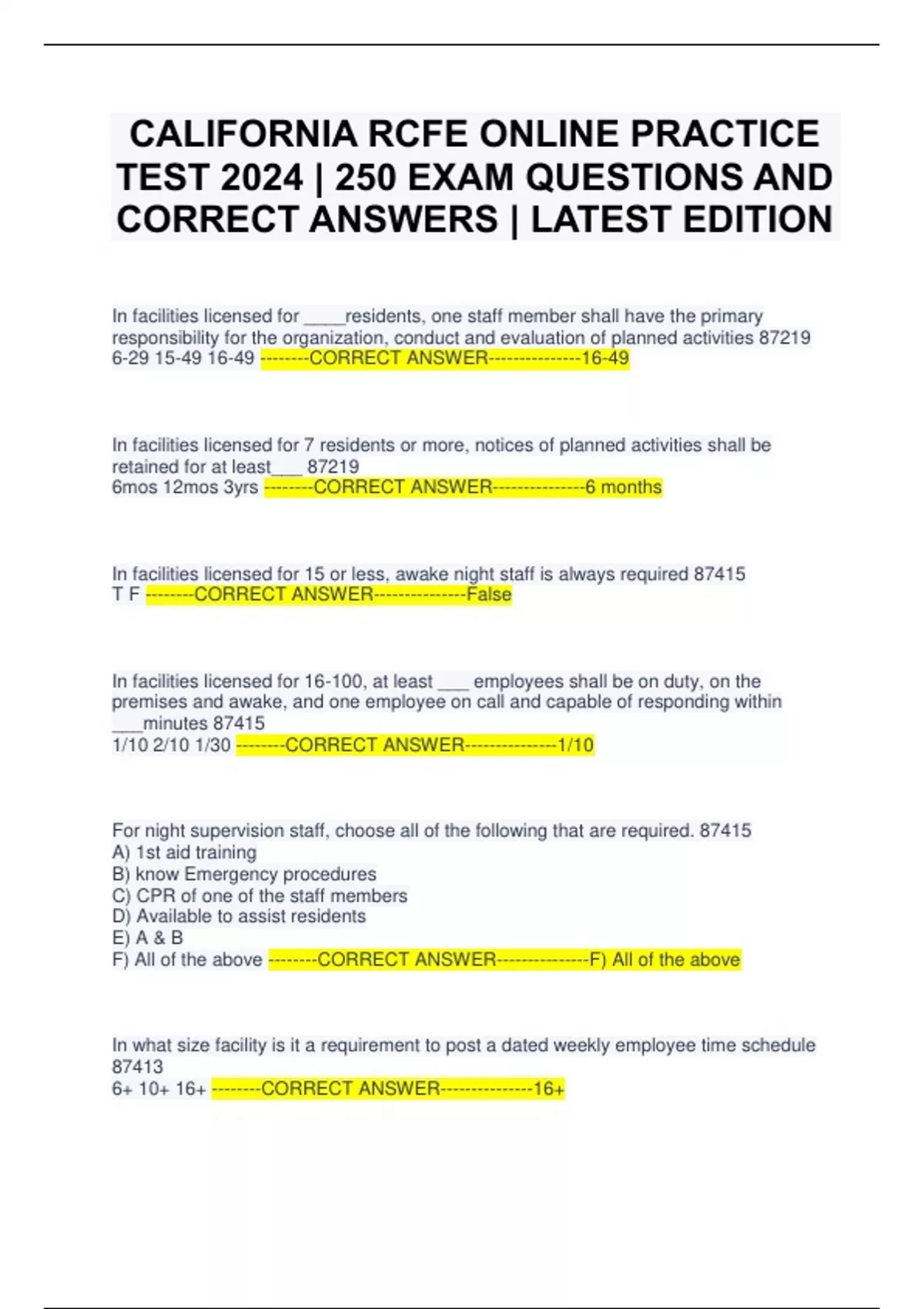 CALIFORNIA RCFE ONLINE PRACTICE TEST 2024 | 250 EXAM QUESTIONS AND CORRECT ANSWERS | LATEST EDITION