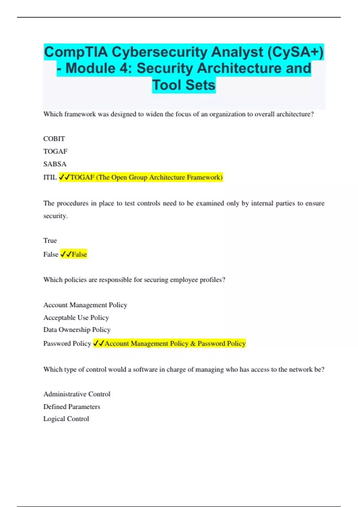 Which framework was designed to widen the focus of an organization to overall architecture? COBIT TOGAF SABSA ITIL TOGAF (The Open Group Architecture Framework) The procedures in place to test controls need to be examined only by internal parties to ensure security. True False False Which policies are responsible for securing employee profiles? Account Management Policy Acceptable Use Policy Data Ownership Policy Password Policy Account Management Policy & Password Policy Which type of control would a software in charge of managing who has access to the network be? Administrative Control Defined Parameters Logical Control