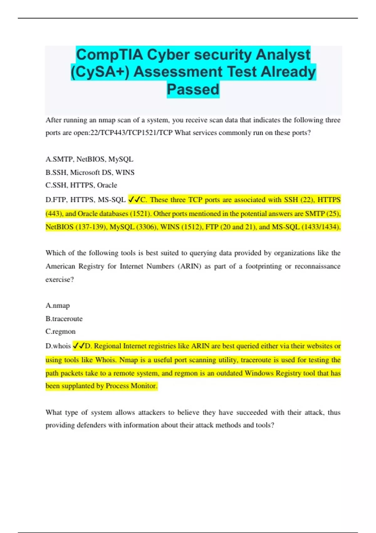 After running an nmap scan of a system, you receive scan data that indicates the following three ports are open:22/TCP443/TCP1521/TCP What services commonly run on these ports? A.SMTP, NetBIOS, MySQL B.SSH, Microsoft DS, WINS C.SSH, HTTPS, Oracle D.FTP, HTTPS, MS-SQL C. These three TCP ports are associated with SSH (22), HTTPS (443), and Oracle databases (1521). Other ports mentioned in the potential answers are SMTP (25), NetBIOS (137-139), MySQL (3306), WINS (1512), FTP (20 and 21), and MS-SQL (1433/1434). Which of the following tools is best suited to querying data provided by organizations like the American Registry for Internet Numbers (ARIN) as part of a footprinting or reconnaissance exercise? A.nmap B.traceroute C.regmon D.whois D. Regional Internet registries like ARIN are best queried either via their websites or using tools like Whois. Nmap is a useful port scanning utility, traceroute is used for testing the path packets take to a remote system, and regmon is an outdated Windows Registry tool that has been supplanted by Process Monitor. What type of system allows attackers to believe they have succeeded with their attack, thus providing defenders with information about their attack methods and tools?