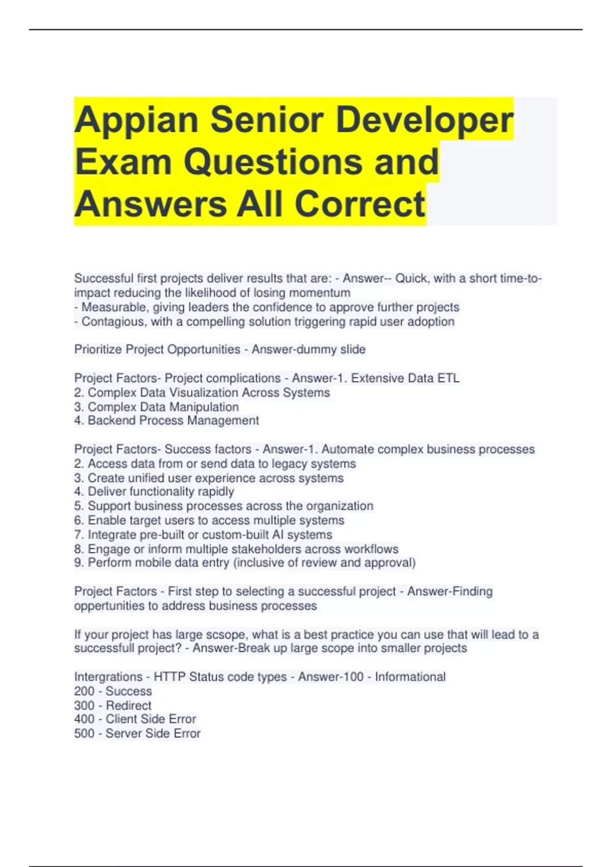 Appian Senior Developer Exam Questions and Answers All Correct Successful first projects deliver results that are: - Answer-- Quick, with a short time-toimpact reducing the likelihood of losing momentum - Measurable, giving leaders the confidence to approve further projects - Contagious, with a compelling solution triggering rapid user adoption Prioritize Project Opportunities - Answer-dummy slide Project Factors- Project complications - Answer-1. Extensive Data ETL 2. Complex Data Visualization Across Systems 3. Complex Data Manipulation 4. Backend Process Management Project Factors- Success factors - Answer-1. Automate complex business processes 2. Access data from or send data to legacy systems 3. Create unified user experience across systems 4. Deliver functionality rapidly 5. Support business processes across the organization 6. Enable target users to access multiple systems 7. Integrate pre-built or custom-built AI systems 8. Engage or inform multiple stakeholders across workflows 9. Perform mobile data entry (inclusive of review and approval) Project Factors - First step to selecting a successful project - Answer-Finding oppertunities to address business processes If your project has large scsope, what is a best practice you can use that will lead to a successfull project? - Answer-Break up large scope into smaller projects Intergrations - HTTP Status code types - Answer-100 - Informational 200 - Success 300 - Redirect 400 - Client Side Error 500 - Server Side Error Integrations - HTTP Status code 401 - Answer-Unauthorised Access Integrations - HTTP STatus Code 404 - Answer-Not found Integrations - Authendication - Two ways to configure authendication - Answer-1. Connected Systems 2. Secure credentials Store Integrations-Authendication - Where can Secure Credentials Store configured - AnswerAppian Admin Console Integrations-Authendication - Expression function - Access Secure Credentials Store - Answer-a!scsField Integrations - Node used to call integrations from process model - Answer-Call Integration Integration - Using in Expression - Answer-Using an expression only works for querying data in an integration. Integration - Query Data - Answer-Only works with Expression Integration - Modifies Data - Answer-1. Works with "Call Integration" smart service in process model 2. Submit from Interface
