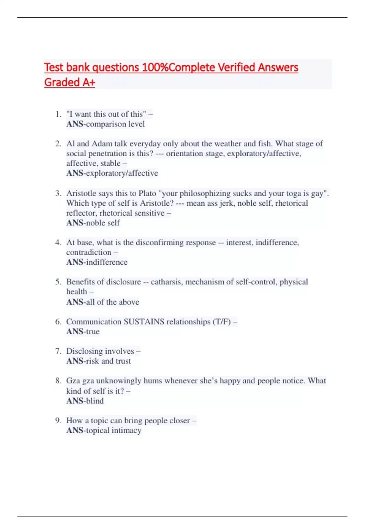 Test bank questions 100%Complete Verified Answers Graded A+ 1. "I want this out of this" – ANS-comparison level 2. Al and Adam talk everyday only about the weather and fish. What stage of social penetration is this? --- orientation stage, exploratory/affective, affective, stable – ANS-exploratory/affective 3. Aristotle says this to Plato "your philosophizing sucks and your toga is gay". Which type of self is Aristotle? --- mean ass jerk, noble self, rhetorical reflector, rhetorical sensitive – ANS-noble self 4. At base, what is the disconfirming response -- interest, indifference, contradiction – ANS-indifference 5. Benefits of disclosure -- catharsis, mechanism of self-control, physical health – ANS-all of the above 6. Communication SUSTAINS relationships (T/F) – ANS-true 7. Disclosing involves – ANS-risk and trust 8. Gza gza unknowingly hums whene