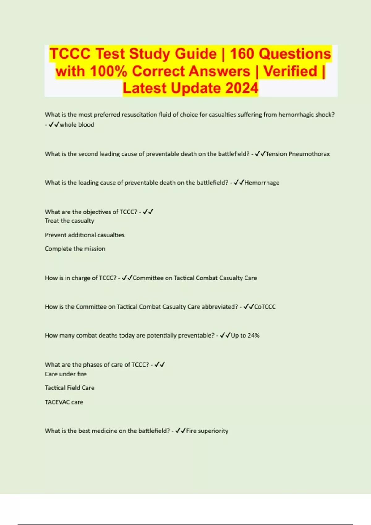 TCCC Test Study Guide | 160 Questions with 100% Correct Answers | Verified | Latest Update 2024