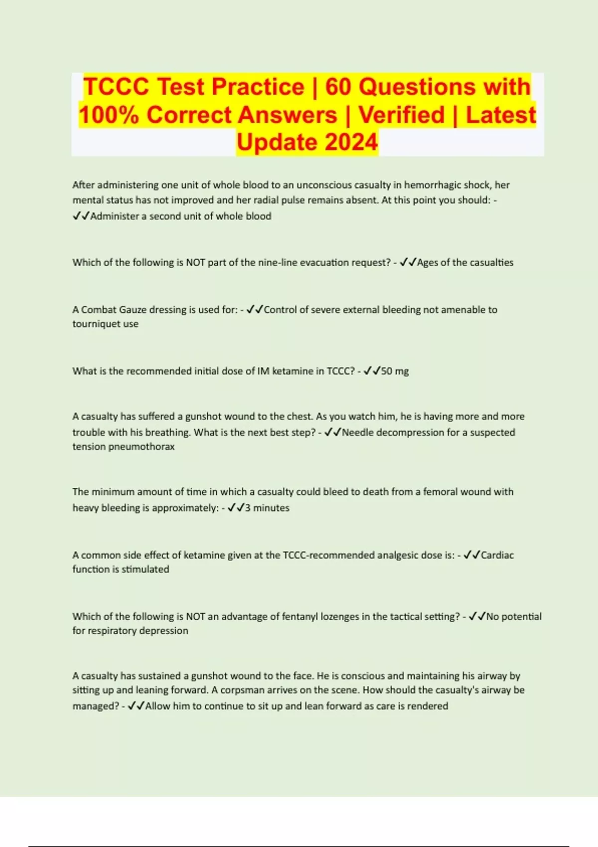 TCCC Test Practice | 60 Questions with 100% Correct Answers | Verified | Latest Update 2024