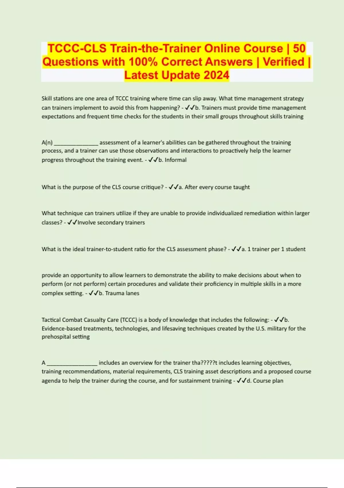 TCCC-CLS Train-the-Trainer Online Course | 50 Questions with 100% Correct Answers | Verified | Latest Update 2024