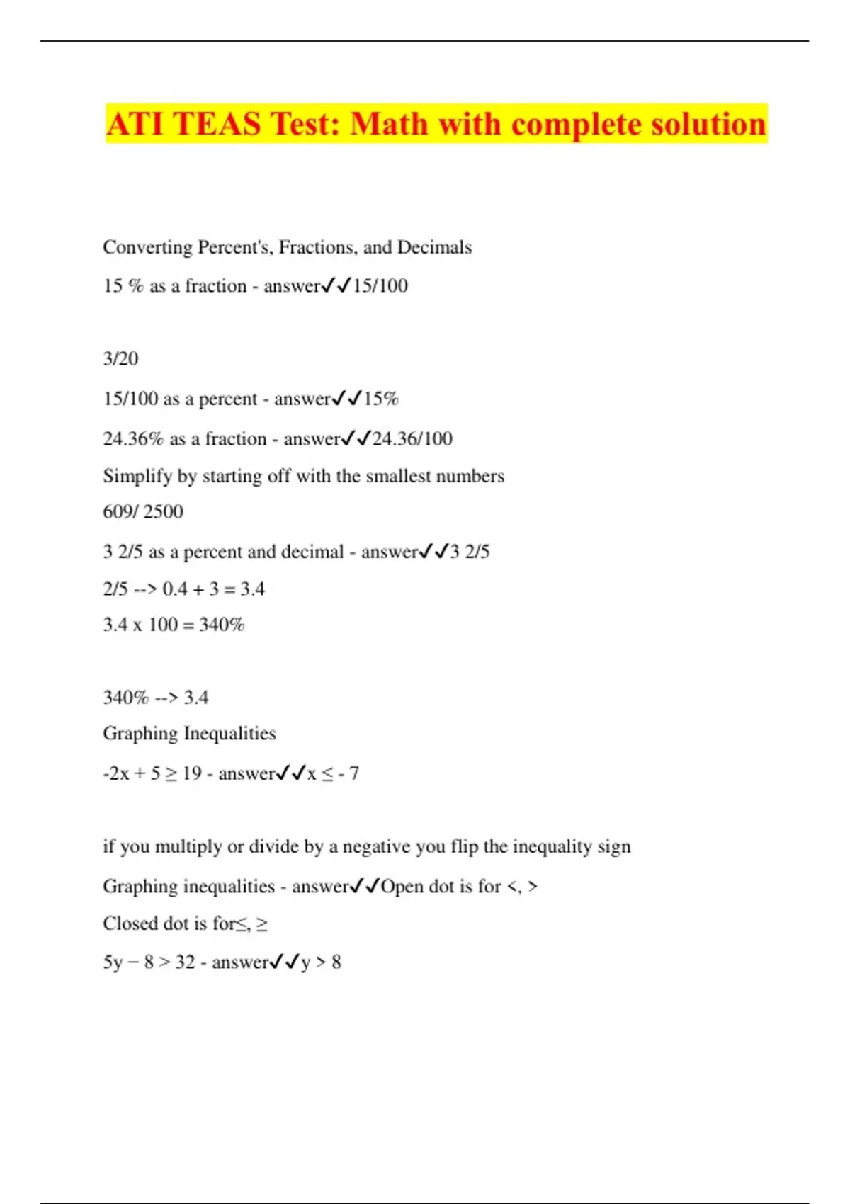 ATI TEAS Test: Math with complete solution Converting Percent's, Fractions, and Decimals 15 % as a fraction - answer15/100 3/20 15/100 as a percent - answer15% 24.36% as a fraction - answer24.36/100 Simplify by starting off with the smallest numbers 609/ 2500 3 2/5 as a percent and decimal - answer3 2/5 2/5 --> 0.4 + 3 = 3.4 3.4 x 100 = 340% 340% --> 3.4 Graphing Inequalities -2x + 5 ≥ 19 - answerx ≤ - 7 if you multiply or divide by a negative you flip the inequality sign Graphing inequalities - answerOpen dot is for <, > Closed dot is for≤, ≥ 5y − 8 > 32 - answery > 8 Mathew has to earn more than 96 points on his high school entrance exam in order to be eligible for varsity sports. each question is worth 3 points, and the test has a total of 40 questions. Let x represent the number of test questions. How many questions can Matthew answer incorrectly and still qualify for varsity sports? - answer0 ≤ X < 8 3x > 96 3x/3 > 96/ 3 x > 32 Rational Numbers from greatest to least 0.3, 27%, √100, 72/9, 1/9, 4.5 - answer√100, 72/9, 4.5, 0.3, 27%, 1/9 -2, -3/4, -0.45, 0.36, 3% - answer-2, -3/4, -0.45, 3%, 0.36 Solve equations in one variable Ray earns $10 an hour. Ray makes $360. How many hours did he work to make $360? - answerX = 36