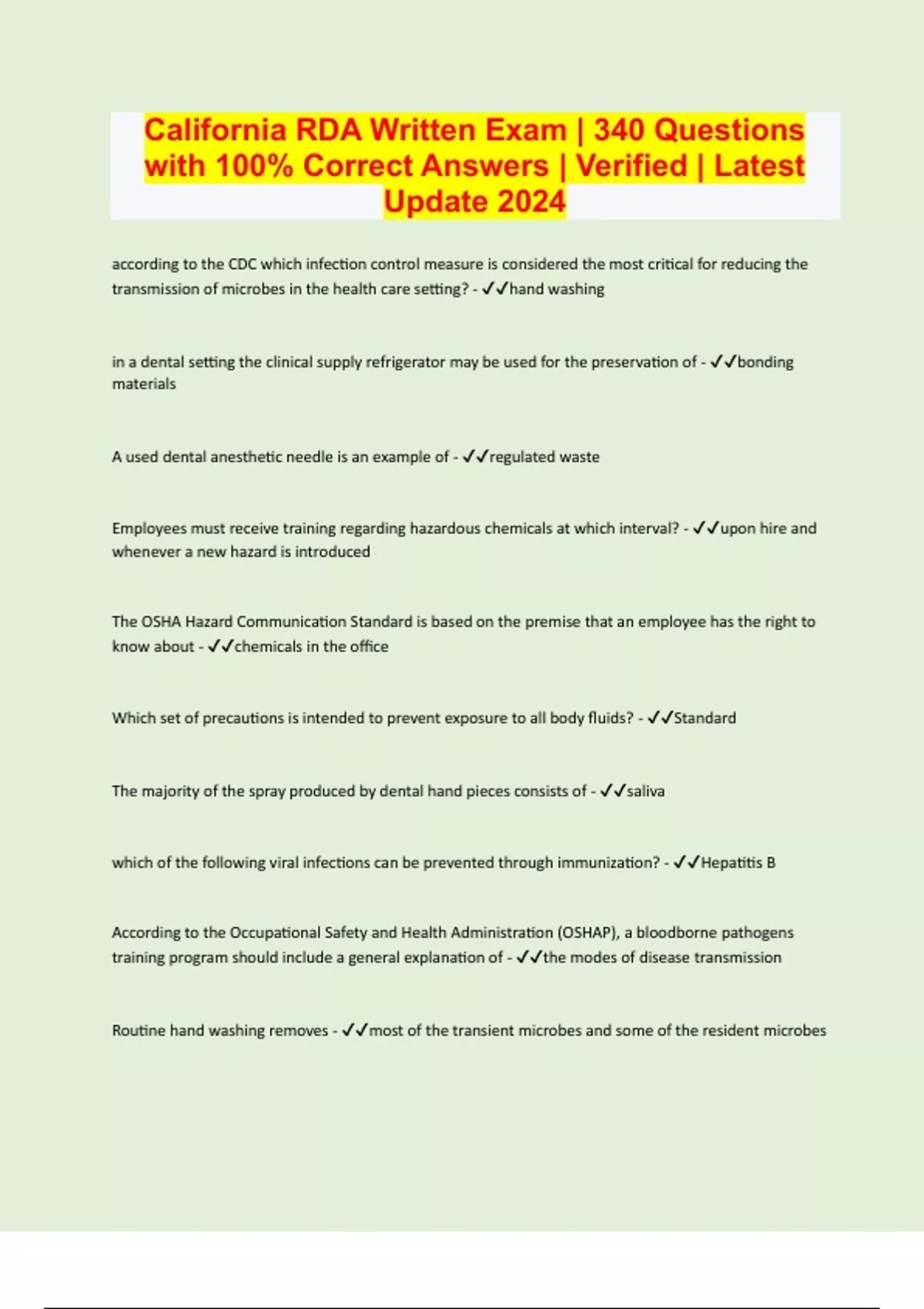 California RDA Written Exam | 340 Questions with 100% Correct Answers | Verified | Latest Update 2024