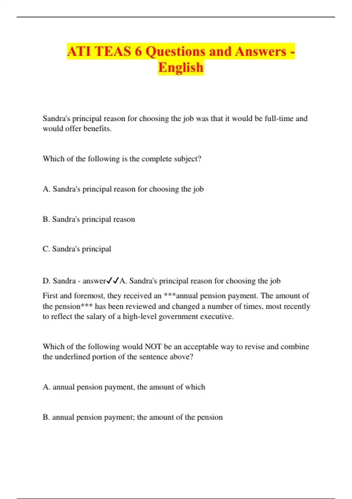 ATI TEAS 6 Questions and Answers - English Sandra's principal reason for choosing the job was that it would be full-time and would offer benefits. Which of the following is the complete subject? A. Sandra's principal reason for choosing the job B. Sandra's principal reason C. Sandra's principal D. Sandra - answerA. Sandra's principal reason for choosing the job First and foremost, they received an ***annual pension payment. The amount of the pension*** has been reviewed and changed a number of times, most recently to reflect the salary of a high-level government executive. Which of the following would NOT be an acceptable way to revise and combine the underlined portion of the sentence above? A. annual pension payment, the amount of which B. annual pension payment; the amount of the pension C. annual pension payment; over the years since 1958, the amount of the pension D. annual pension payment, the amount of the pension - answerD. annual pension payment, the amount of the pension Typically, water that has evaporated remains in the sky in cloud form for less than ten days before falling to Earth again as precipitation. Which of the following parts of speech is remains as used in the sentence? A. noun B. verb C. adjective D. adverb - answerB. verb On Parents' Day, a public holiday in the Democratic Republic of Congo, families celebrate parents' both living and dec