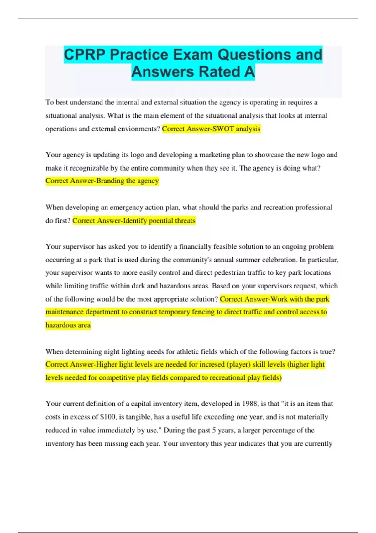 To best understand the internal and external situation the agency is operating in requires a situational analysis. What is the main element of the situational analysis that looks at internal operations and external envionments? Correct Answer-SWOT analysis Your agency is updating its logo and developing a marketing plan to showcase the new logo and make it recognizable by the entire community when they see it. The agency is doing what? Correct Answer-Branding the agency When developing an emergency action plan, what should the parks and recreation professional do first? Correct Answer-Identify poential threats Your supervisor has asked you to identify a financially feasible solution to an ongoing problem occurring at a park that is used during the community's annual summer celebration. In particular, your supervisor wants to more easily control and direct pedestrian traffic to key park locations while limiting traffic within dark and hazardous areas. Based on your supervisors request, which of the following would be the most appropriate solution? Correct Answer-Work with the park maintenance department to construct temporary fencing to direct traffic and control access to hazardous area When determining night lighting needs for athletic fields which of the following factors is true? Correct Answer-Higher light levels are needed for incresed (player) skill levels (higher light levels needed for competitive play fields compared to recreational play fields) Your current definition of a capital inventory item, developed in 1988, is that "it is an item that costs in excess of $100, is tangible, has a useful life exceeding one year, and is not materially reduced in value immediately by use." During the past 5 years, a larger percentage of the inventory has been missing each year. Your inventory this year indicates that you are currently