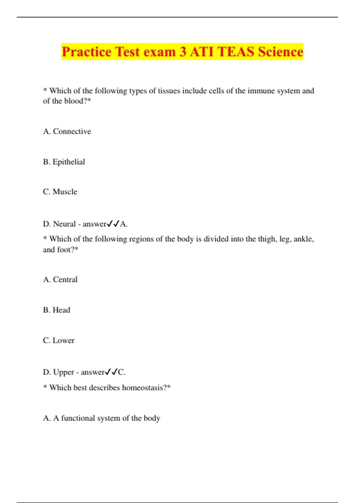 Practice Test exam 3 ATI TEAS Science * Which of the following types of tissues include cells of the immune system and of the blood?* A. Connective B. Epithelial C. Muscle D. Neural - answerA. * Which of the following regions of the body is divided into the thigh, leg, ankle, and foot?* A. Central B. Head C. Lower D. Upper - answerC. * Which best describes homeostasis?* A. A functional system of the body B. Blood flow to every cell in the body C. A relatively constant environment within the body D. Neutral pathways that have integrated into the body - answerC. * Which substance is plasma mostly composed of?* A. Albumin B. Leukocytes C. Platelets D. Water - answerD * Which blood group is a universal d