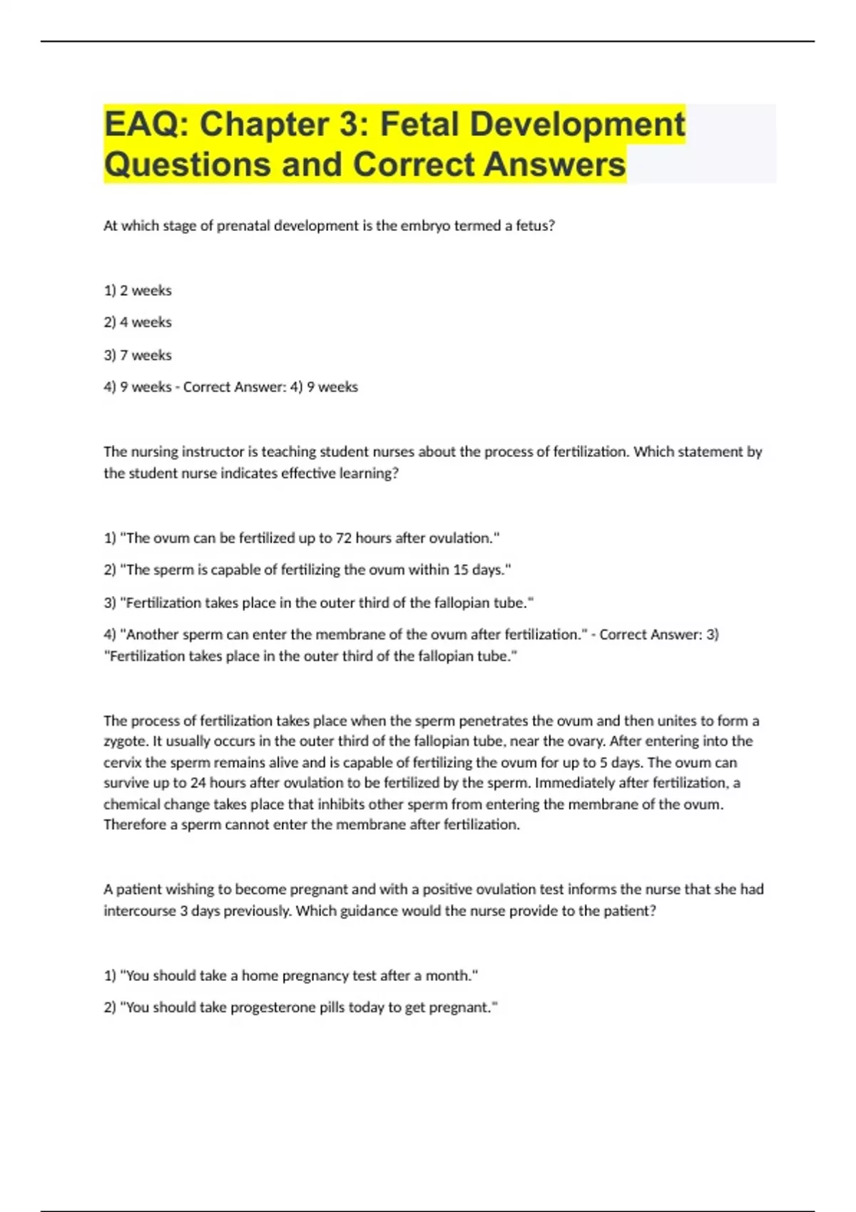 EAQ Chapter 3 Fetal Development Questions and Correct Answers