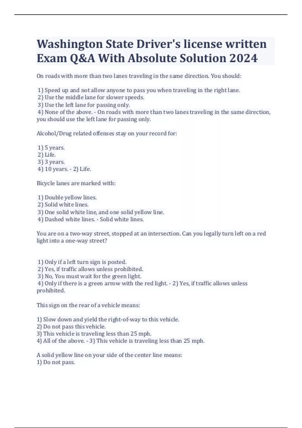 Washington State Driver's license written Exam Q&A With Absolute Solution 2024 On roads with more than two lanes traveling in the same direction. You should: 1) Speed up and not allow anyone to pass you when traveling in the right lane. 2) Use the middle lane for slower speeds. 3) Use the left lane for passing only. 4) None of the above. - On roads with more than two lanes traveling in the same direction, you should use the left lane for passing only. Alcohol/Drug related offenses stay on your record for: 1) 5 years. 2) Life. 3) 3 years. 4) 10 years. - 2) Life. Bicycle lanes are marked with: 1) Double yellow lines. 2) Solid white lines. 3) One solid white line, and one solid yellow line. 4) Dashed white lines. - Solid white lines. You are on a two-way street, stopped at an intersection. Can you legally turn left on a red light into a one-way street? 1) Only if a left turn sign is posted. 2) Yes, if traffic allows unless prohibited. 3) No, You must wait for the green light. 4) Only if there is a green arrow with the red light. - 2) Yes, if traffic allows unless prohibited. This sign on the rear of a vehicle means: 1) Slow down and yield the right-of-way to this vehicle. 2) Do not pass this vehicle. 3) This vehicle is traveling less than 25 mph. 4) All of the above. - 3) This vehicle is traveling less than 25 mph. A solid yellow line on your side of the center line means: 1) Do not pass. 2) Pass with caution. 3) Slow down. 4) Keep right on hills. - 1) Do not pass. A yellow light that flashes on and off means: 1) Speed up to clear the intersection quickly. 2) Stop and wait for a green light. 3) Slow down and proceed with caution. 4) Stop and look, then go if there is no traffic. - 3) Slow down and proceed with caution. If you refuse to take a blood alcohol content test, you will lose your driver license for: 1) 90 days. 2) At least 2 years. 3) 6 months. 4) At least 1 year. - 4) At least 1 year. When riding at night, your bicycle must have a white headlight visible for: 1) 600 feet. 2) 400 feet. 3) 300 feet. 4) 500 feet. - 4) 500 feet. If you stop along the road at night: 1) Use your parking lights only. 2) Use your headlights only. 3) Turn on your emergency flashers and leave your low beams on. 4) Turn off all your lights. - 3) Turn on your emergency flashers and leave your low beams on. You must dim your high-beam lights when within: 1) 250 feet of an oncoming vehicle. 2) 300 feet of an oncoming vehicle. 3) 500 feet of an oncoming vehicle. 4) 100 feet of an oncoming vehicle. - 3) 500 feet of an oncoming vehicle. In Washington State, a person is legally drunk when their Blood Alcohol Content (BAC) level is: 1) At or above 1 percent. 2) At or above .08 percent. 3) At or above .01 percent. 4) At or above .12 percent. - 2) At or above .08 percent. When in travel lanes on the roadway: 1) You may stop to look up an address. 2) You may stop to let out passengers. 3) You may make a U-turn or back up if you get on the wrong entrance ramp of the freeway. 4) Don't stop for any reason. Keep moving until you can safely pull off the road. - 4) Don't stop for any reason. Keep moving until you can safely pull off the road. If you see side-by-side red lights flashing at a railroad crossing, you must: 1) Slow down. 2) Stop. 3) Maintain speed and cross the railroad. 4) Signal before going any further. - 2) Stop. f your brakes stop working, you should first: 1) Flash your lights at other traffic. 2) Jump out of the vehicle immediately. 3) Shift the car's transmission into neutral. 4) Pump the brake pedal several times and try to build up brake pressure. - 4) Pump the brake pedal several times and try to build up brake pressure. The correct way to use a freeway exit ramp is: 1) Slow down before entering the exit ramp. 2) Pass slower traffic in the exit ramp. 3) Don't slow down until you move onto the exit ramp. 4) Keep your speed constant once in the exit ramp. - 3) Don't slow down until you move onto the exit ramp. To avoid being in a truck or bus driver's blind spot and help them see, you should: 1) Sound your horn. 2) Never pass them. 3) Avoid driving on either side and don't tailgate. 4) Flash your lights. - 3) Avoid driving on either side and don't tailgate. At an uncontrolled intersection, you must: 1) Wait for the other traffic to signal you to go. 2) Speed up and clear the intersection quickly. 3) Slow down and yield to any vehicle in the intersection and to those coming from the right. 4) Take the right of way cautiously. - 3) Slow down and yield to any vehicle in the intersection and to those coming from the right. When you see a school bus on a road with 2 lanes traveling in opposite directions, you must stop: 1) If the red warning lights on the bus are flashing. 2) If the bus is off the road and the yellow lights are flashing. 3) Only if you're going in the same direction as the bus. 4) If the bus has flashing yellow lights. - 1) If the red warning lights on the bus are flashing. You may park or stop along the shoulder of the freeway: 1) If you need to look at a map for directions. 2) If no part of your vehicle is on the road. 3) Only if you have an emergency. 4) As long as you turn on your 4-way (emergency) flashers. - 3) Only if you have an emergency. By law, your vehicle's lights must be turned on from: 1) 30 minutes after sunset until 30 minutes before sunrise. 2) 1 hour before sunset until 1 hour before sunrise. 3) 1 hour after sunset until 1 hour after sunrise. 4) 30 minutes before sunset until 30 minutes before sunrise. - 1) 30 minutes after sunset until 30 minutes before sunrise. A bicyclist who doesn't obey traffic laws: 1) Will have their bicycle impounded. 2) Will always receive a warning from law enforcement. 3) Is okay, because bicyclists don't have to obey traffic laws. 4) Can be ticketed. - 4) Can be ticketed. If you're going to turn left onto a 1-way street, you should complete the turn into: 1) The right lane. 2) Either lane. 3) Neither lane. 4) The lane closest to the one you came