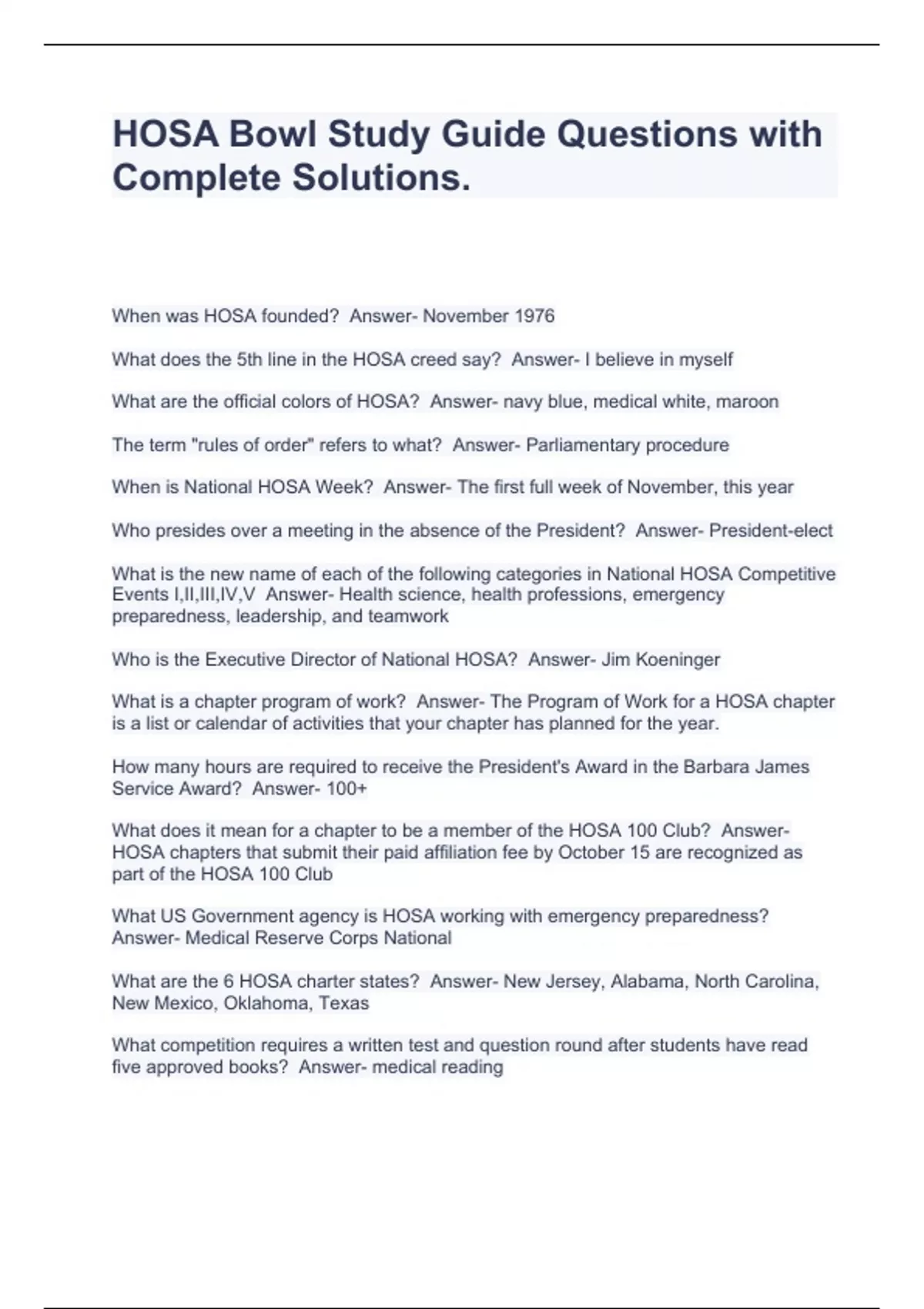 HOSA Bowl Study Guide Questions with Complete Solutions