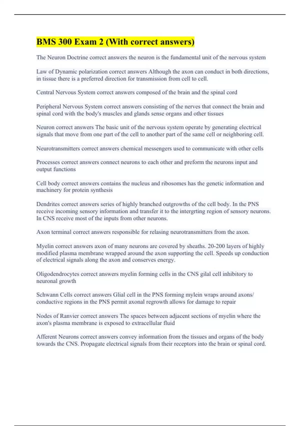 The Neuron Doctrine correct answers the neuron is the fundamental unit of the nervous system Law of Dynamic polarization correct answers Although the axon can conduct in both directions, in tissue there is a preferred direction for transmission from cell to cell. Central Nervous System correct answers composed of the brain and the spinal cord Peripheral Nervous System correct answers consisting of the nerves that connect the brain and spinal cord with the body's muscles and glands sense organs and other tissues Neuron correct answers The basic unit of the nervous system operate by generating electrical signals that move from one part of the cell to another part of the same cell or neighboring cell. Neurotransmitters correct answers chemical messengers used to communicate with other cells Processes correct answers connect neurons to each other and preform the neurons input and output functions Cell body correct answers contains the nucleus and ribosomes has the genetic information and machinery for protein synthesis Dendrites correct answers series of highly branched outgrowths of the cell body. In the PNS receive incoming sensory information and transfer it to the intergrting region of sensory neurons. In CNS receive most of the inputs from other neurons. Axon terminal correct answers responsible for relasing neurotransmitters from the axon. Myelin correct answers axon of many neurons are covered by sheaths. 20-200 layers of highly modified plasma membrane wrapped around the axon supporting the cell. Speeds up conduction of electrical signals along the axon and conserves energy. Oligodendrocytes correct answers myelin forming cells in the CNS gilal cell inhibitory to neuronal growth Schwann Cells correct answers Glial cell in the PNS forming mylein wraps around axons/ conductive regions in the PNS permit axonal regrowth allows for damage to repair Nodes of Ranvier correct answers The spaces between adjacent sections of myelin where the axon's plasma membrane is exposed to extracellular fluid Afferent Neurons correct answers convey information from the tissues and organs of the body towards the CNS. Propagate electrical signals from their receptors into the brain or spinal cord.