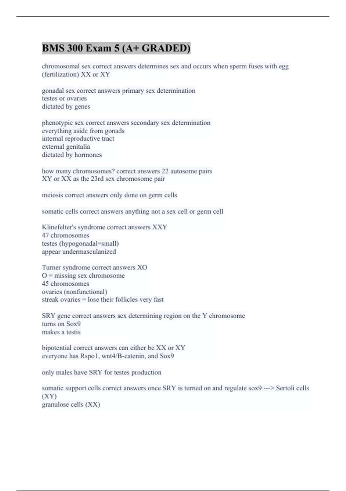 chromosomal sex correct answers determines sex and occurs when sperm fuses with egg (fertilization) XX or XY gonadal sex correct answers primary sex determination testes or ovaries dictated by genes phenotypic sex correct answers secondary sex determination everything aside from gonads internal reproductive tract external genitalia dictated by hormones how many chromosomes? correct answers 22 autosome pairs XY or XX as the 23rd sex chromosome pair meiosis correct answers only done on germ cells somatic cells correct answers anything not a sex cell or germ cell Klinefelter's syndrome correct answers XXY 47 chromosomes testes (hypogonadal=small) appear undermasculanized Turner syndrome correct answers XO O = missing sex chromosome 45 chromosomes ovaries (nonfunctional) streak ovaries = lose their follicles very fast SRY gene correct answers sex determining region on the Y chromosome turns on Sox9 makes a testis bipotential correct answers can either be XX or XY everyone has Rspo1, wnt4/B-catenin, and Sox9 only males have SRY for testes production somatic support cells correct answers once SRY is turned on and regulate sox9 ---> Sertoli cells (XY) granulose cells (XX)