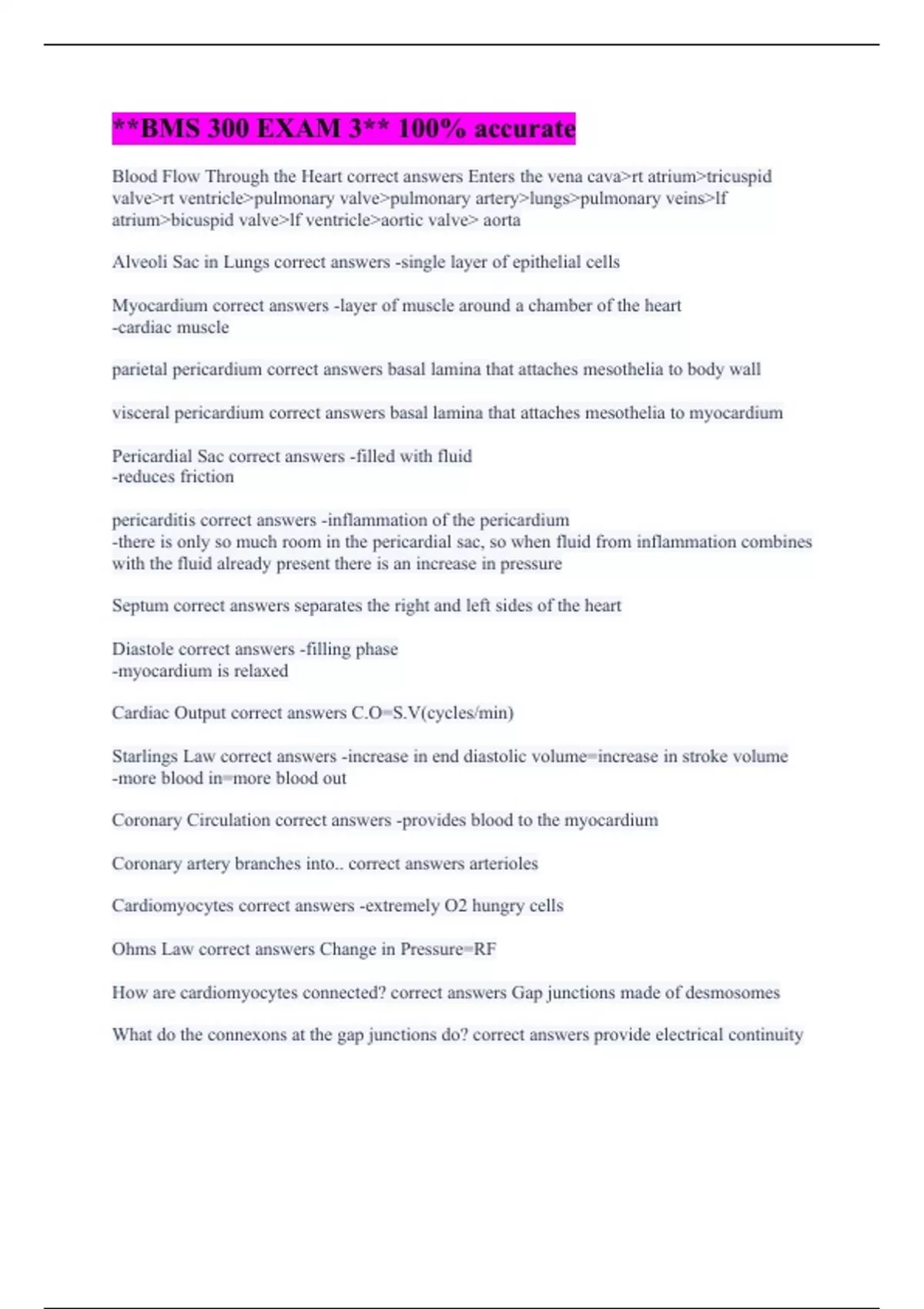 Blood Flow Through the Heart correct answers Enters the vena cava>rt atrium>tricuspid valve>rt ventricle>pulmonary valve>pulmonary artery>lungs>pulmonary veins>lf atrium>bicuspid valve>lf ventricle>aortic valve> aorta Alveoli Sac in Lungs correct answers -single layer of epithelial cells Myocardium correct answers -layer of muscle around a chamber of the heart -cardiac muscle parietal pericardium correct answers basal lamina that attaches mesothelia to body wall visceral pericardium correct answers basal lamina that attaches mesothelia to myocardium Pericardial Sac correct answers -filled with fluid -reduces friction pericarditis correct answers -inflammation of the pericardium -there is only so much room in the pericardial sac, so when fluid from inflammation combines with the fluid already present there is an increase in pressure Septum correct answers separates the right and left sides of the heart Diastole correct answers -filling phase -myocardium is relaxed Cardiac Output correct answers C.O=S.V(cycles/min) Starlings Law correct answers -increase in end diastolic volume=increase in stroke volume -more blood in=more blood out Coronary Circulation correct answers -provides blood to the myocardium Coronary artery branches into.. correct answers arterioles Cardiomyocytes correct answers -extremely O2 hungry cells Ohms Law correct answers Change in Pressure=RF How are cardiomyocytes connected? correct answers Gap junctions made of desmosomes What do the connexons at the gap junctions do? correct answers provide electrical continuity
