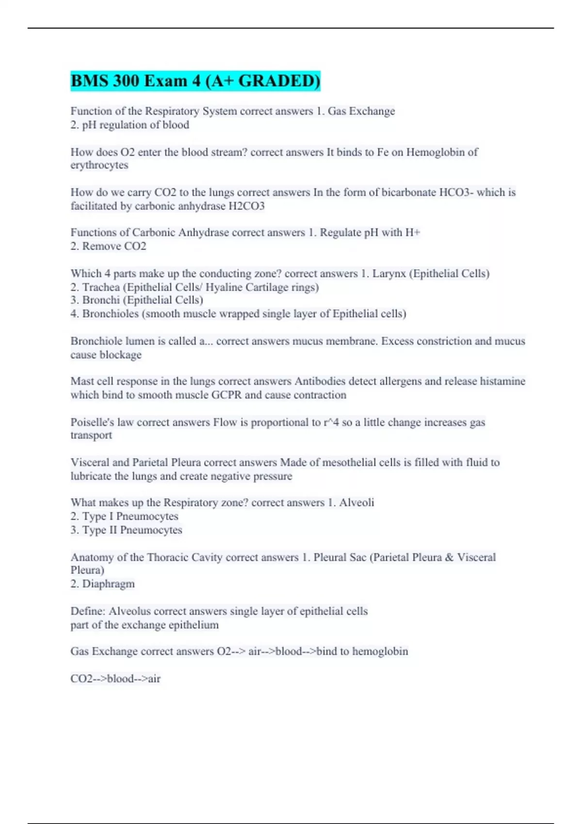 Function of the Respiratory System correct answers 1. Gas Exchange 2. pH regulation of blood How does O2 enter the blood stream? correct answers It binds to Fe on Hemoglobin of erythrocytes How do we carry CO2 to the lungs correct answers In the form of bicarbonate HCO3- which is facilitated by carbonic anhydrase H2CO3 Functions of Carbonic Anhydrase correct answers 1. Regulate pH with H+ 2. Remove CO2 Which 4 parts make up the conducting zone? correct answers 1. Larynx (Epithelial Cells) 2. Trachea (Epithelial Cells/ Hyaline Cartilage rings) 3. Bronchi (Epithelial Cells) 4. Bronchioles (smooth muscle wrapped single layer of Epithelial cells) Bronchiole lumen is called a... correct answers mucus membrane. Excess constriction and mucus cause blockage Mast cell response in the lungs correct answers Antibodies detect allergens and release histamine which bind to smooth muscle GCPR and cause contraction Poiselle's law correct answers Flow is proportional to r^4 so a little change increases gas transport Visceral and Parietal Pleura correct answers Made of mesothelial cells is filled with fluid to lubricate the lungs and create negative pressure What makes up the Respiratory zone? correct answers 1. Alveoli 2. Type I Pneumocytes 3. Type II Pneumocytes Anatomy of the Thoracic Cavity correct answers 1. Pleural Sac (Parietal Pleura & Visceral Pleura) 2. Diaphragm Define: Alveolus correct answers single layer of epithelial cells part of the exchange epithelium Gas Exchange correct answers O2--> air-->blood-->bind to hemoglobin CO2-->blood-->air