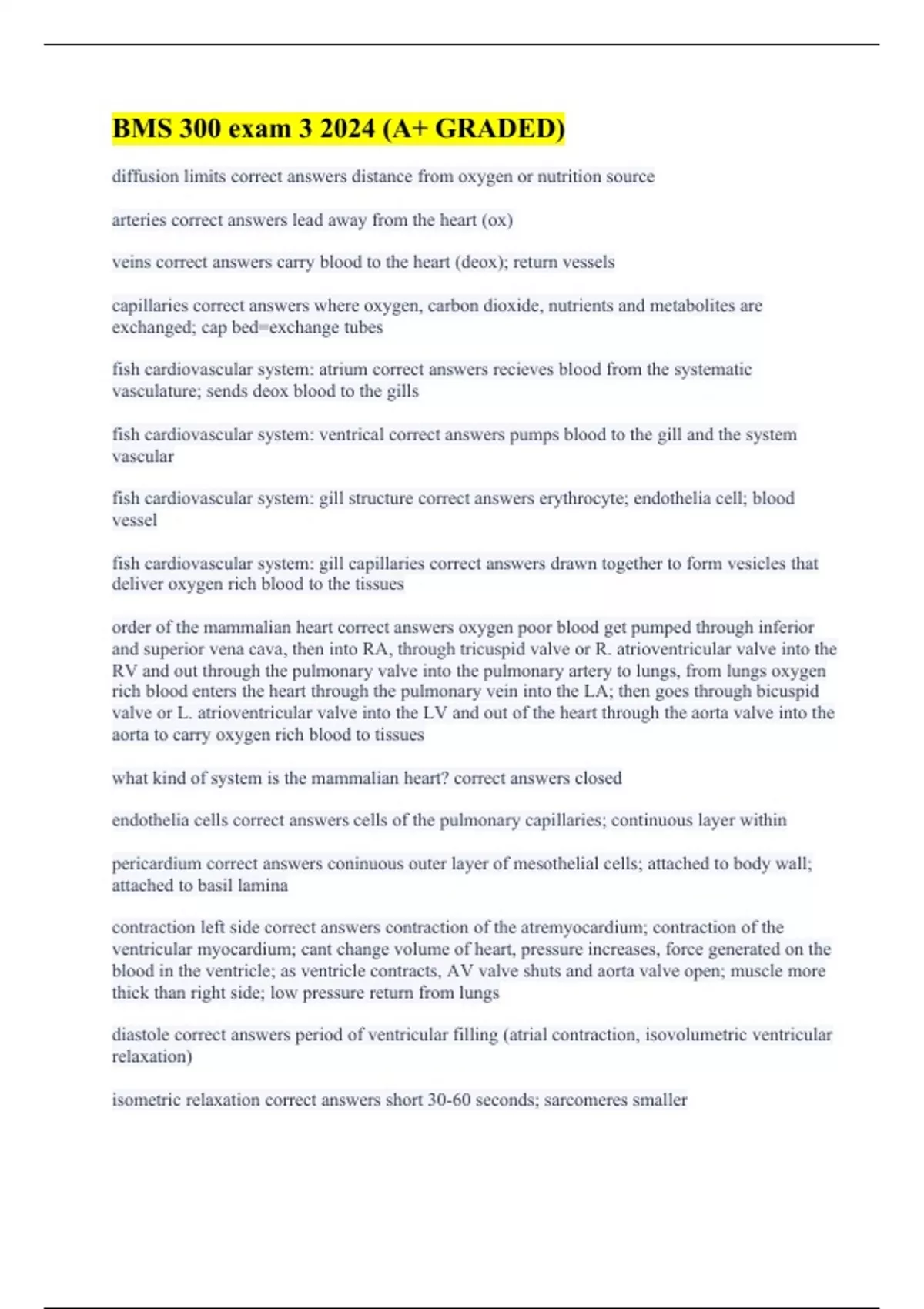 diffusion limits correct answers distance from oxygen or nutrition source arteries correct answers lead away from the heart (ox) veins correct answers carry blood to the heart (deox); return vessels capillaries correct answers where oxygen, carbon dioxide, nutrients and metabolites are exchanged; cap bed=exchange tubes fish cardiovascular system: atrium correct answers recieves blood from the systematic vasculature; sends deox blood to the gills fish cardiovascular system: ventrical correct answers pumps blood to the gill and the system vascular fish cardiovascular system: gill structure correct answers erythrocyte; endothelia cell; blood vessel fish cardiovascular system: gill capillaries correct answers drawn together to form vesicles that deliver oxygen rich blood to the tissues order of the mammalian heart correct answers oxygen poor blood get pumped through inferior and superior vena cava, then into RA, through tricuspid valve or R. atrioventricular valve into the RV and out through the pulmonary valve into the pulmonary artery to lungs, from lungs oxygen rich blood enters the heart through the pulmonary vein into the LA; then goes through bicuspid valve or L. atrioventricular valve into the LV and out of the heart through the aorta valve into the aorta to carry oxygen rich blood to tissues what kind of system is the mammalian heart? correct answers closed endothelia cells correct answers cells of the pulmonary capillaries; continuous layer within pericardium correct answers coninuous outer layer of mesothelial cells; attached to body wall; attached to basil lamina contraction left side correct answers contraction of the atremyocardium; contraction of the ventricular myocardium; cant change volume of heart, pressure increases, force generated on the blood in the ventricle; as ventricle contracts, AV valve shuts and aorta valve open; muscle more thick than right side; low pressure return from lungs diastole correct answers period of ventricular filling (atrial contraction, isovolumetric ventricular relaxation) isometric relaxation correct answers short 30-60 seconds; sarcomeres smaller