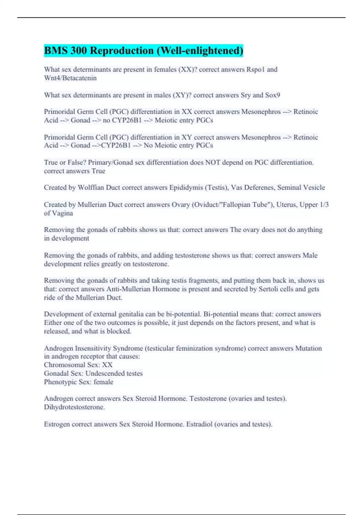 What sex determinants are present in females (XX)? correct answers Rspo1 and Wnt4/Betacatenin What sex determinants are present in males (XY)? correct answers Sry and Sox9 Primoridal Germ Cell (PGC) differentiation in XX correct answers Mesonephros --> Retinoic Acid --> Gonad --> no CYP26B1 --> Meiotic entry PGCs Primoridal Germ Cell (PGC) differentiation in XY correct answers Mesonephros --> Retinoic Acid --> Gonad -->CYP26B1 --> No Meiotic entry PGCs True or False? Primary/Gonad sex differentiation does NOT depend on PGC differentiation. correct answers True Created by Wolffian Duct correct answers Epididymis (Testis), Vas Deferenes, Seminal Vesicle Created by Mullerian Duct correct answers Ovary (Oviduct/"Fallopian Tube"), Uterus, Upper 1/3 of Vagina Removing the gonads of rabbits shows us that: correct answers The ovary does not do anything in development Removing the gonads of rabbits, and adding testosterone shows us that: correct answers Male development relies greatly on testosterone. Removing the gonads of rabbits and taking testis fragments, and putting them back in, shows us that: correct answers Anti-Mullerian Hormone is present and secreted by Sertoli cells and gets ride of the Mullerian Duct. Development of external genitalia can be bi-potential. Bi-potential means that: correct answers Either one of the two outcomes is possible, it just depends on the factors present, and what is released, and what is blocked. Androgen Insensitivity Syndrome (testicular feminization syndrome) correct answers Mutation in androgen receptor that causes: Chromosomal Sex: XX Gonadal Sex: Undescended testes Phenotypic Sex: female Androgen correct answers Sex Steroid Hormone. Testosterone (ovaries and testes). Dihydrotestosterone. Estrogen correct answers Sex Steroid Hormone. Estradiol (ovaries and testes).