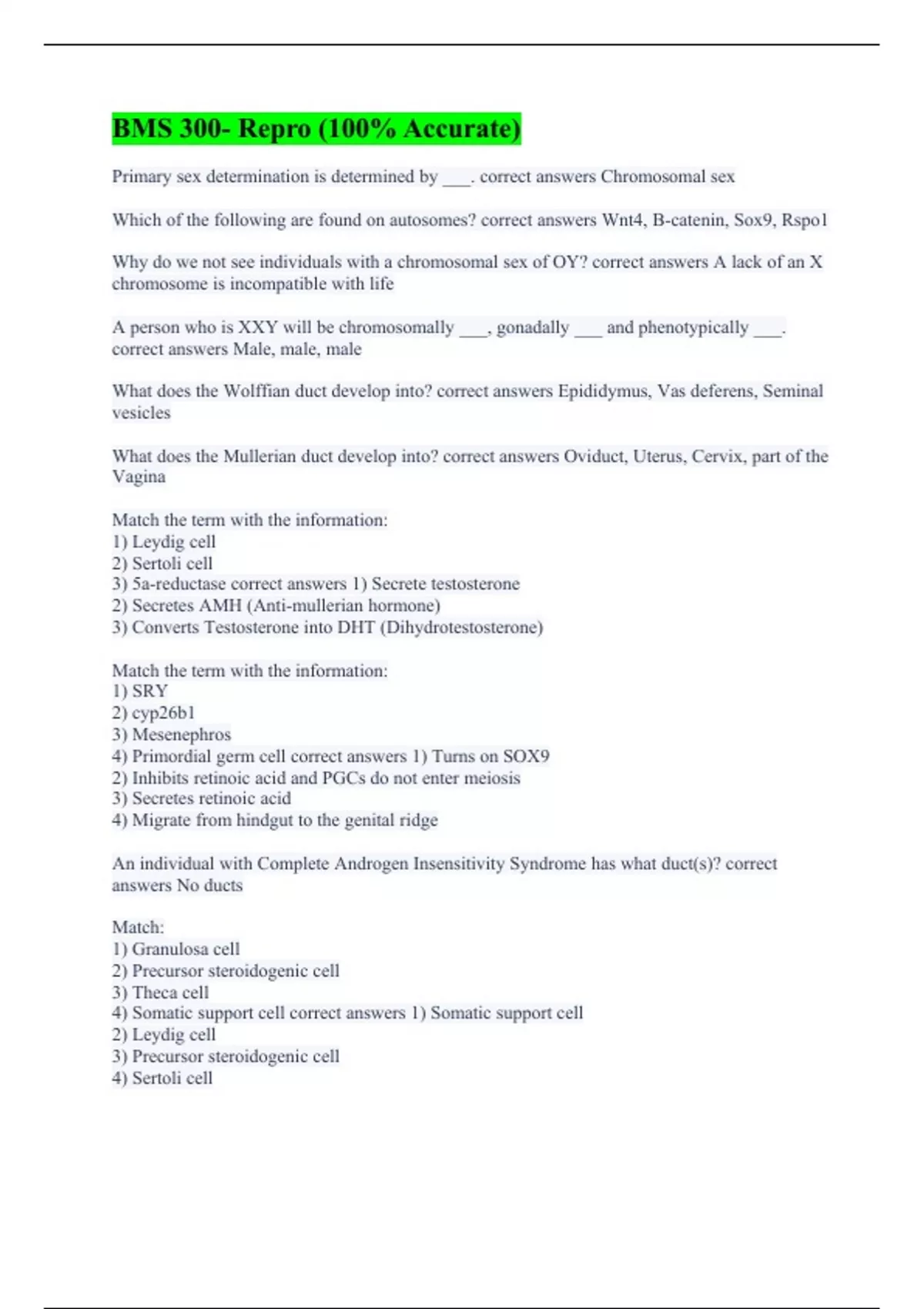 Primary sex determination is determined by ___. correct answers Chromosomal sex Which of the following are found on autosomes? correct answers Wnt4, B-catenin, Sox9, Rspo1 Why do we not see individuals with a chromosomal sex of OY? correct answers A lack of an X chromosome is incompatible with life A person who is XXY will be chromosomally ___, gonadally ___ and phenotypically ___. correct answers Male, male, male What does the Wolffian duct develop into? correct answers Epididymus, Vas deferens, Seminal vesicles What does the Mullerian duct develop into? correct answers Oviduct, Uterus, Cervix, part of the Vagina Match the term with the information: 1) Leydig cell 2) Sertoli cell 3) 5a-reductase correct answers 1) Secrete testosterone 2) Secretes AMH (Anti-mullerian hormone) 3) Converts Testosterone into DHT (Dihydrotestosterone) Match the term with the information: 1) SRY 2) cyp26b1 3) Mesenephros 4) Primordial germ cell correct answers 1) Turns on SOX9 2) Inhibits retinoic acid and PGCs do not enter meiosis 3) Secretes retinoic acid 4) Migrate from hindgut to the genital ridge An individual with Complete Androgen Insensitivity Syndrome has what duct(s)? correct answers No ducts Match: 1) Granulosa cell 2) Precursor steroidogenic cell 3) Theca cell 4) Somatic support cell correct answers 1) Somatic support cell 2) Leydig cell 3) Precursor steroidogenic cell 4) Sertoli cell