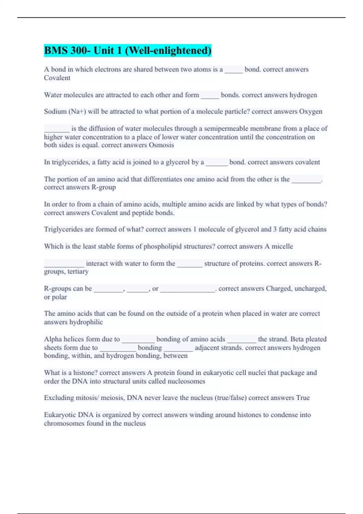 A bond in which electrons are shared between two atoms is a _____ bond. correct answers Covalent Water molecules are attracted to each other and form _____ bonds. correct answers hydrogen Sodium (Na+) will be attracted to what portion of a molecule particle? correct answers Oxygen _______ is the diffusion of water molecules through a semipermeable membrane from a place of higher water concentration to a place of lower water concentration until the concentration on both sides is equal. correct answers Osmosis In triglycerides, a fatty acid is joined to a glycerol by a ______ bond. correct answers covalent The portion of an amino acid that differentiates one amino acid from the other is the ________. correct answers R-group In order to from a chain of amino acids, multiple amino acids are linked by what types of bonds? correct answers Covalent and peptide bonds. Triglycerides are formed of what? correct answers 1 molecule of glycerol and 3 fatty acid chains Which is the least stable forms of phospholipid structures? correct answers A micelle ___________ interact with water to form the _______ structure of proteins. correct answers R-groups, tertiary R-groups can be ________, ______, or _______________. correct answers Charged, uncharged, or polar The amino acids that can be found on the outside of a protein when placed in water are correct answers hydrophilic Alpha helices form due to _________ bonding of amino acids ________ the strand. Beta pleated sheets form due to __________ bonding ________ adjacent strands. correct answers hydrogen bonding, within, and hydrogen bonding, between What is a histone? correct answers A protein found in eukaryotic cell nuclei that package and order the DNA into structural units called nucleosomes Excluding mitosis/ meiosis, DNA never leave the nucleus (true/false) correct answers True Eukaryotic DNA is organized by correct answers winding around histones to condense into chromosomes found in the nucleus