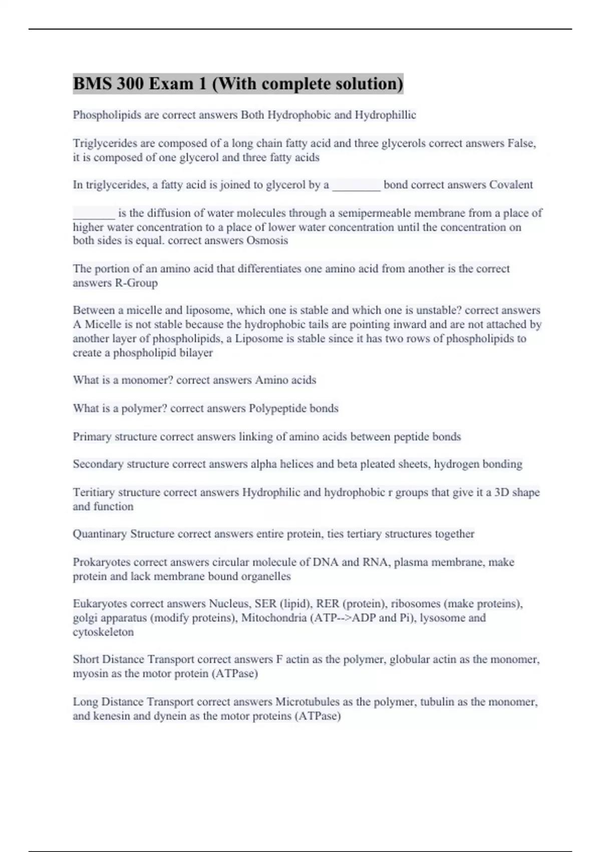 Phospholipids are correct answers Both Hydrophobic and Hydrophillic Triglycerides are composed of a long chain fatty acid and three glycerols correct answers False, it is composed of one glycerol and three fatty acids In triglycerides, a fatty acid is joined to glycerol by a ________ bond correct answers Covalent _______ is the diffusion of water molecules through a semipermeable membrane from a place of higher water concentration to a place of lower water concentration until the concentration on both sides is equal. correct answers Osmosis The portion of an amino acid that differentiates one amino acid from another is the correct answers R-Group Between a micelle and liposome, which one is stable and which one is unstable? correct answers A Micelle is not stable because the hydrophobic tails are pointing inward and are not attached by another layer of phospholipids, a Liposome is stable since it has two rows of phospholipids to create a phospholipid bilayer What is a monomer? correct answers Amino acids What is a polymer? correct answers Polypeptide bonds Primary structure correct answers linking of amino acids between peptide bonds Secondary structure correct answers alpha helices and beta pleated sheets, hydrogen bonding Teritiary structure correct answers Hydrophilic and hydrophobic r groups that give it a 3D shape and function Quantinary Structure correct answers entire protein, ties tertiary structures together Prokaryotes correct answers circular molecule of DNA and RNA, plasma membrane, make protein and lack membrane bound organelles Eukaryotes correct answers Nucleus, SER (lipid), RER (protein), ribosomes (make proteins), golgi apparatus (modify proteins), Mitochondria (ATP-->ADP and Pi), lysosome and cytoskeleton Short Distance Transport correct answers F actin as the polymer, globular actin as the monomer, myosin as the motor protein (ATPase) Long Distance Transport correct answers Microtubules as the polymer, tubulin as the monomer, and kenesin and dynein as the motor proteins (ATPase)