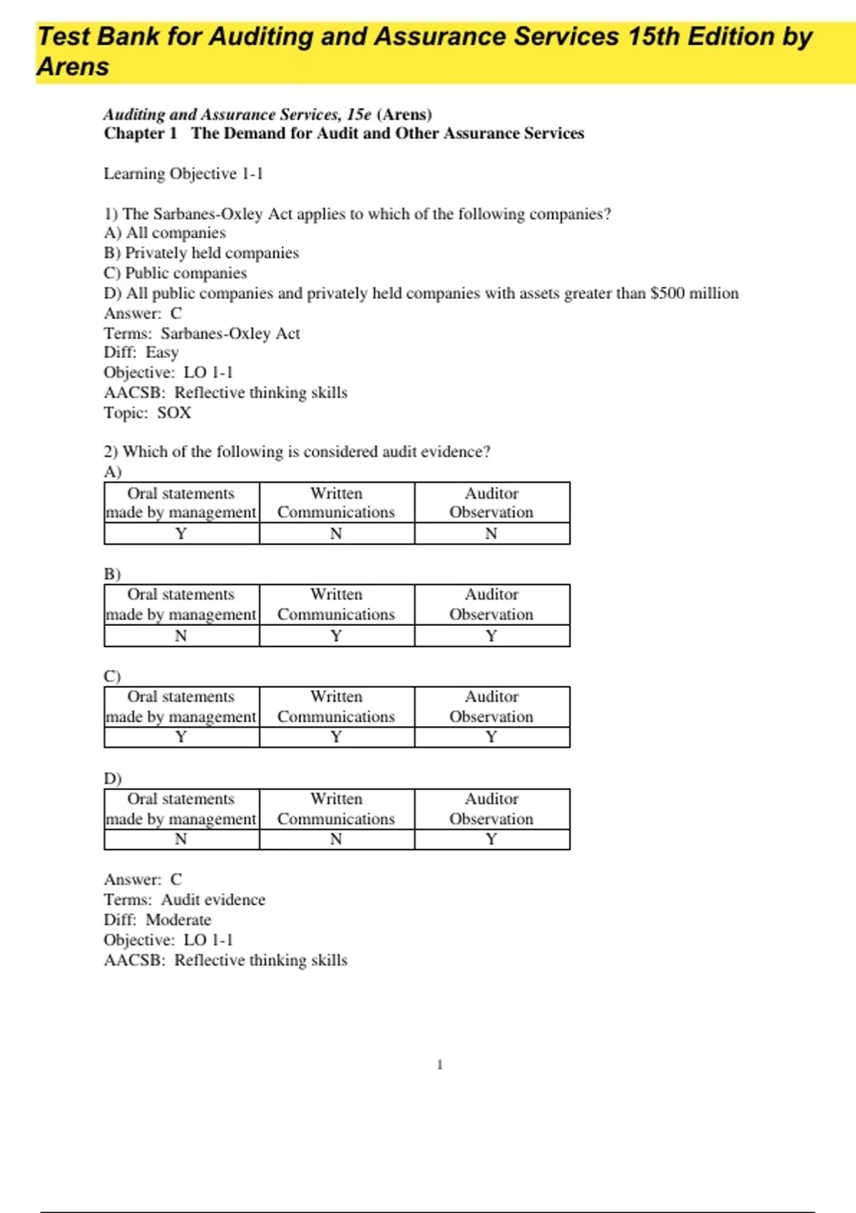 Test Bank for Auditing and Assurance Services, 15th Edition Arens|Complete
