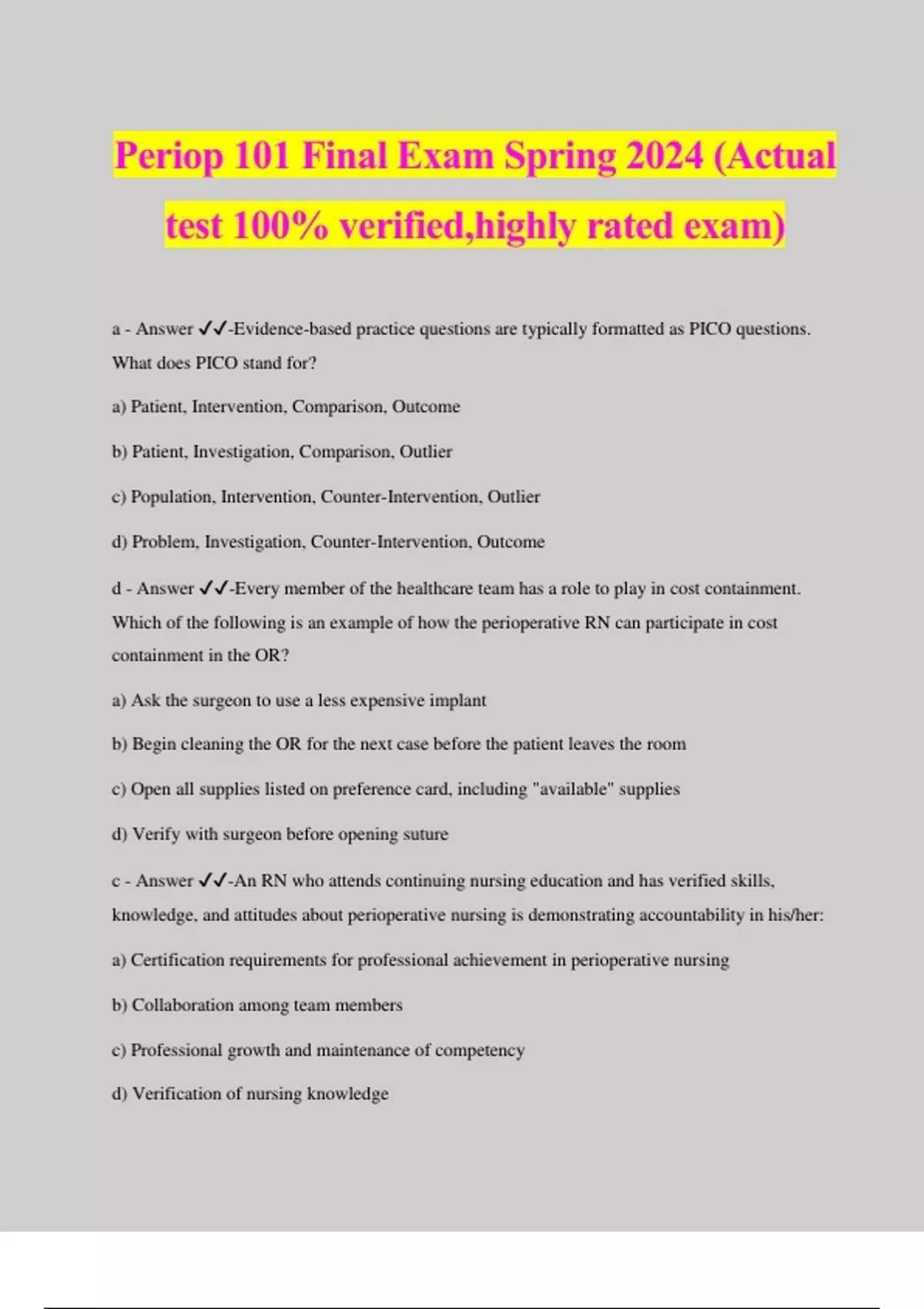 Periop 101 Final Exam Spring 2024 (Actual test 100% verified,highly rated exam)