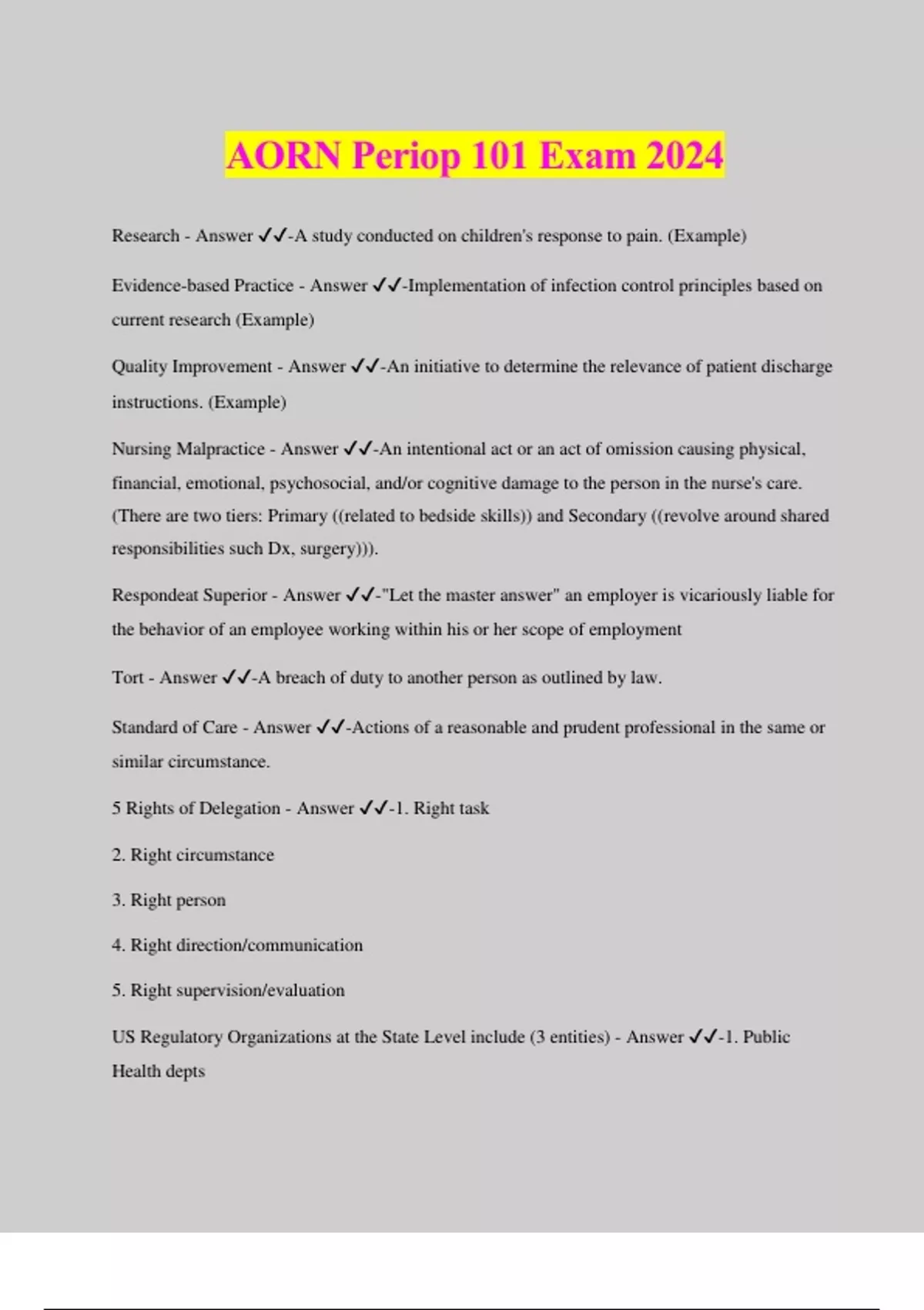 AORN Periop 101 Exam 2024 Research - Answer ️️ -A study conducted on children's response to pain. (Example) Evidence-based Practice - Answer ️️ -Implementation of infection control principles based on current research (Example) Quality Improvement - Answer ️️ -An initiative to determine the relevance of patient discharge instructions. (Example) Nursing Malpractice - Answer ️️ -An intentional act or an act of omission causing physical, financial, emotional, psychosocial, and/or cognitive damage to the person in the nurse's care. (There are two tiers: Primary ((related to bedside skills)) and Secondary ((revolve around shared responsibilities such Dx, surgery))). Respondeat Superior - Answer ️️ -"Let the master answer" an employer is vicariously liable for the behavior of an employee working within his or her scope of employment Tort - Answer ️️ -A breach of duty to another person as outlined by law. Standard of Care - Answer ️️ -Actions of a reasonable and prudent professional in the same or similar circumstance. 5 Rights of Delegation - Answer ️️ -1. Right task 2. Right circumstance 3. Right person 4. Right direction/communication 5. Right supervision/evaluation US Regulatory Organizations at the State Level include (3 entities) - Answer ️️ -1. Public Health depts 2. Licensing Boards 3. Insurance commissioners US Accreditation Agencies (4 entities) - Answer ️️ -1. AAAHC (Ambulatory Health Care) 2. ACHC (Health Care) 3. DNV GL 4. TJC (The Joint Commission) Professional Organizations to help guide practice (2 entities) - Answer ️️ -1. ASCA (Surgery Center Association) 2. AORN (Association of periOperative Registered Nurses) 4 Elements of Safety Culture - Answer ️️ -1. Consistent and safe delivery of services. 2. Collaborative efforts among all teams and disciplines. 3. Environment that places reporting of errors and near misses ahead of blaming and recrimination. 4. Commitment of resources that focuses on safety. Key takeaways from IOM "To Err is Human: Building a Safer Health System" - Answer ️️ - 44,000 to 98,000 patient deaths may occur each year in the U.S. from PREVENTABLE MEDICAL ERRORS 2010 Future of Nursing IOM Report (4 recommendations) - Answer ️️ -1. Nurses should strive for higher levels of education and training. 2. Nurses should practice to the full extent of their education and training. 3. Nurses should be full partners with all health professionals in the redesign of US health care. 4. Better data collection and information infrastructure are necessary for workforce planning and policy creation. Types of Errors (3 types) - Answer ️️ -1. Skill-based error (ex: incorrect ESU settings, wrong button pushed, etc) 2. Situational factor error (ex: under stress, etc) 3. Knowledge-based performance error (ex: fails to respond to an alarm) What type of culture changes care delivery as a result of an error? - Answer ️️ -Culture of Safety AORN advocates through Guidelines for Perioperative Practice and: (3 terms) - Answer ️️ -1. Position Statements 2. Tool Kits 3. Mission, Vision, and Values Statements The Surgical Safety Checklist was an initiative of what organization? - Answer ️️ -WHO (World Health Organization) Which major entity publishes regulatory requirements? - Answer ️️ -Centers for Medicare & Medicaid Services (CMMS)