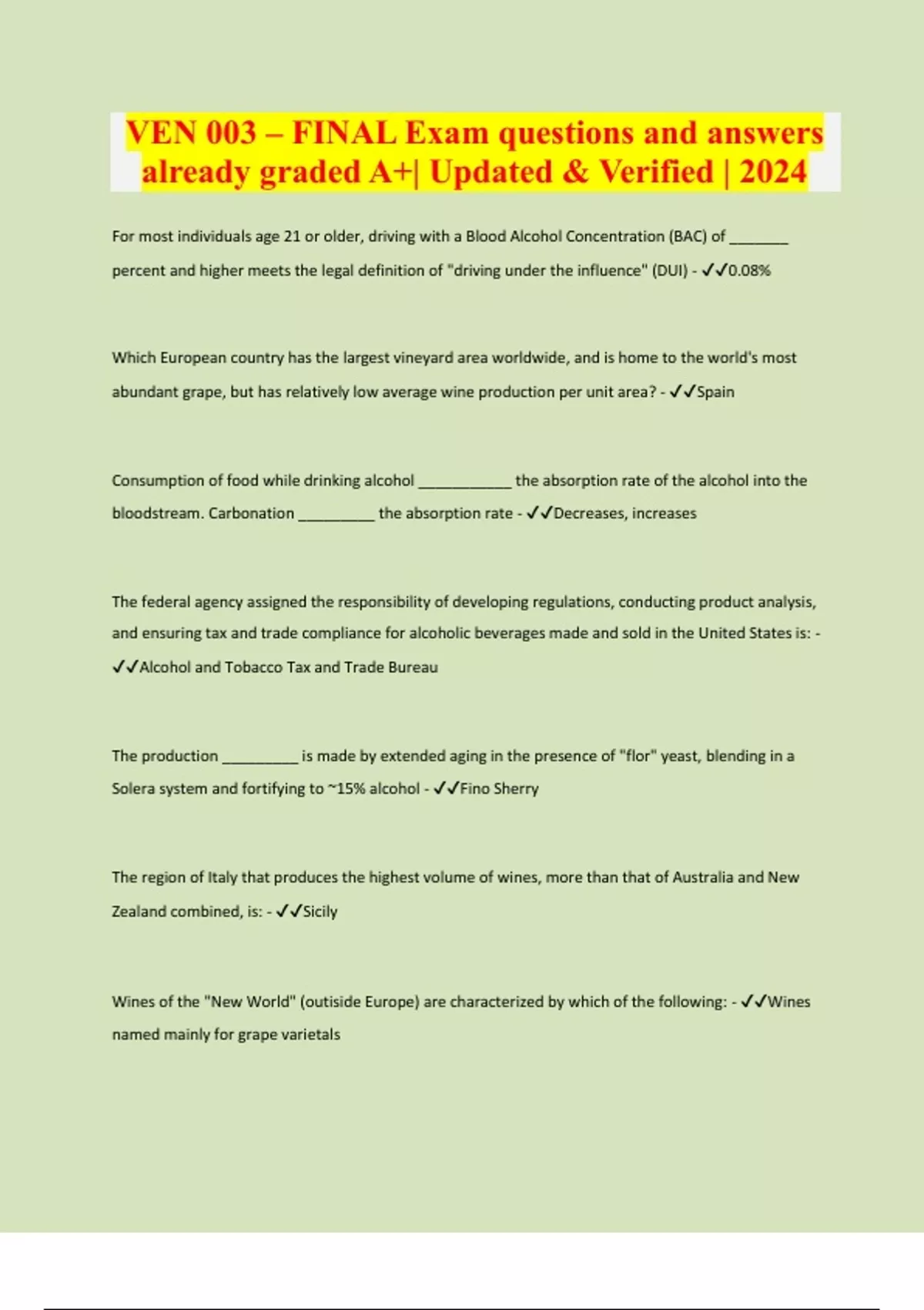 VEN 003 – FINAL Exam questions and answers already graded A+| Updated & Verified | 2024