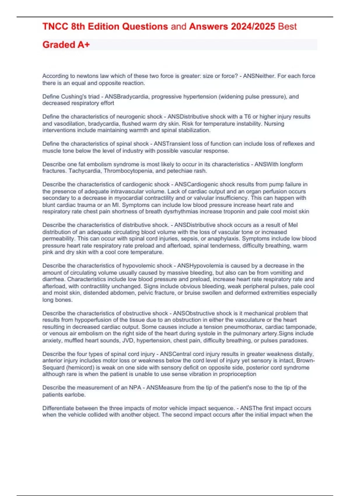 TNCC FULL SOLUTION PACK(ALL TNCC EXAMS AND STUDY QUESTIONS ARE HERE ,GRADED A+ ALL ANSWERED CORRECTLY LATEST 2025)