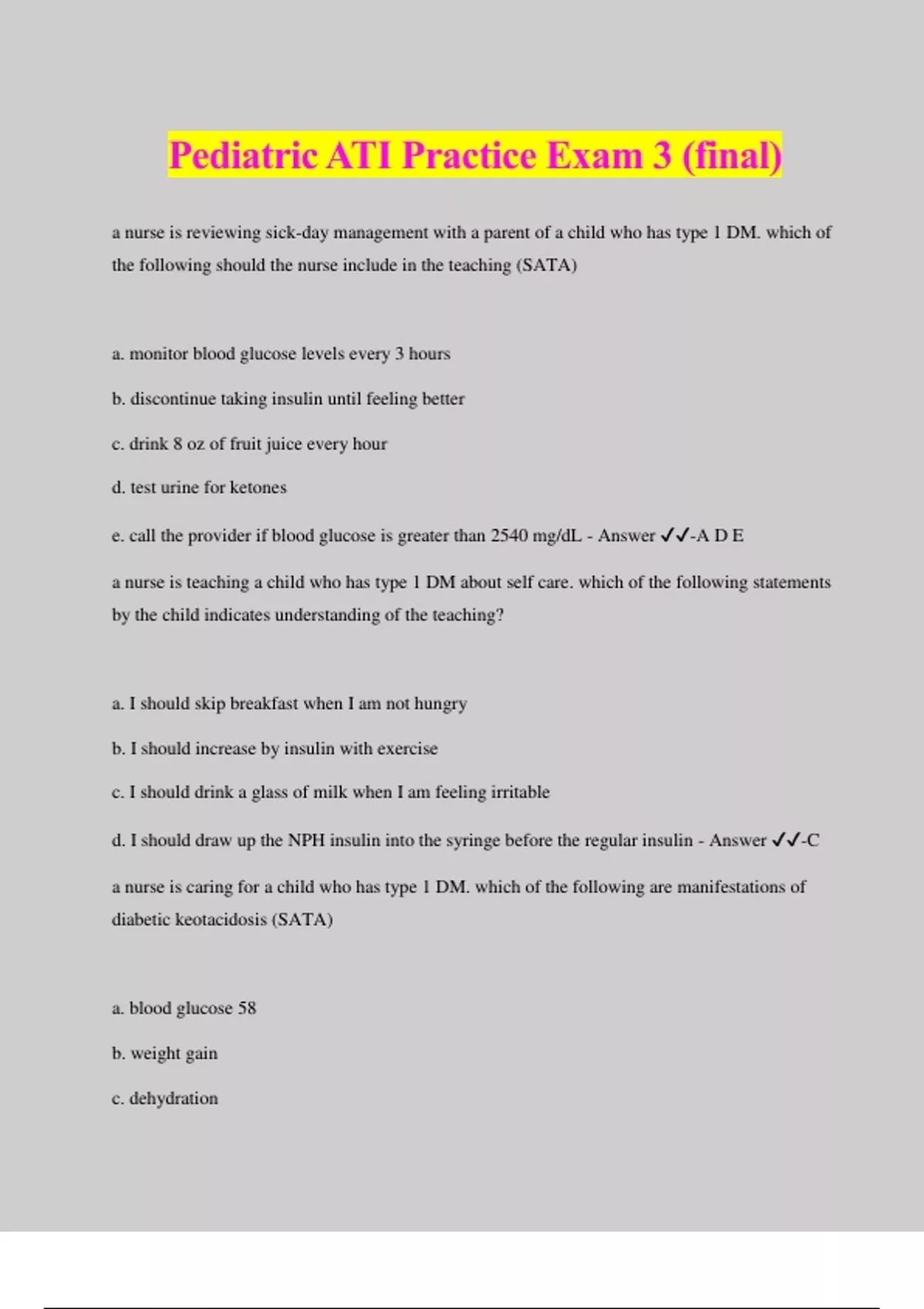 Pediatric ATI Practice Exam 3 (final) a nurse is reviewing sick-day management with a parent of a child who has type 1 DM. which of the following should the nurse include in the teaching (SATA) a. monitor blood glucose levels every 3 hours b. discontinue taking insulin until feeling better c. drink 8 oz of fruit juice every hour d. test urine for ketones e. call the provider if blood glucose is greater than 2540 mg/dL - Answer ️️ -A D E a nurse is teaching a child who has type 1 DM about self care. which of the following statements by the child indicates understanding of the teaching? a. I should skip breakfast when I am not hungry b. I should increase by insulin with exercise c. I should drink a glass of milk when I am feeling irritable d. I should draw up the NPH insulin into the syringe before the regular insulin - Answer ️️ -C a nurse is caring for a child who has type 1 DM. which of the following are manifestations of diabetic keotacidosis (SATA) a. blood glucose 58 b. weight gain c. dehydration d. mental confusion e. fruit breath - Answer ️️ -C D E a nurse is teaching a school-age child who has DM about insulin administration. which of the following should the nurse include in the teaching? a. you should inject the needle at a 30 degree angle b. you should combine your glargine and regular insulin in the same syringe c. you should aspirate for blood before injecting the insulin d. you should give four or five injections in one area before switching sites - Answer ️️ -D a nurse is teaching an adolescent who has DM about manifestations of hypoglycemia. which of the following findings should the nurse include in the teaching (SATA) a. increased urination b. hunger c. signs of dehydration d. irritability e. sweating f. kussmaul respirations - Answer ️️ -B D E a nurse is caring for a child who has short stature. which of the following diagnostic tests should be completed to confirm growth hormone (GH) deficiency? (SATA) a. CT scan of the head b. bone age scan c. GH stimulation test D. serum IGF-1 e. DNA testing - Answer ️️ -A B C D a nurse is teaching the parent of a child who has growth hormone deficiency. which of the following are complications of untreated growth hormone deficiency? (SATA) a. delayed sexual development b. premature aging c. advanced bone age d. short stature e. increased epiphyseal closure - Answer ️️ -A B D