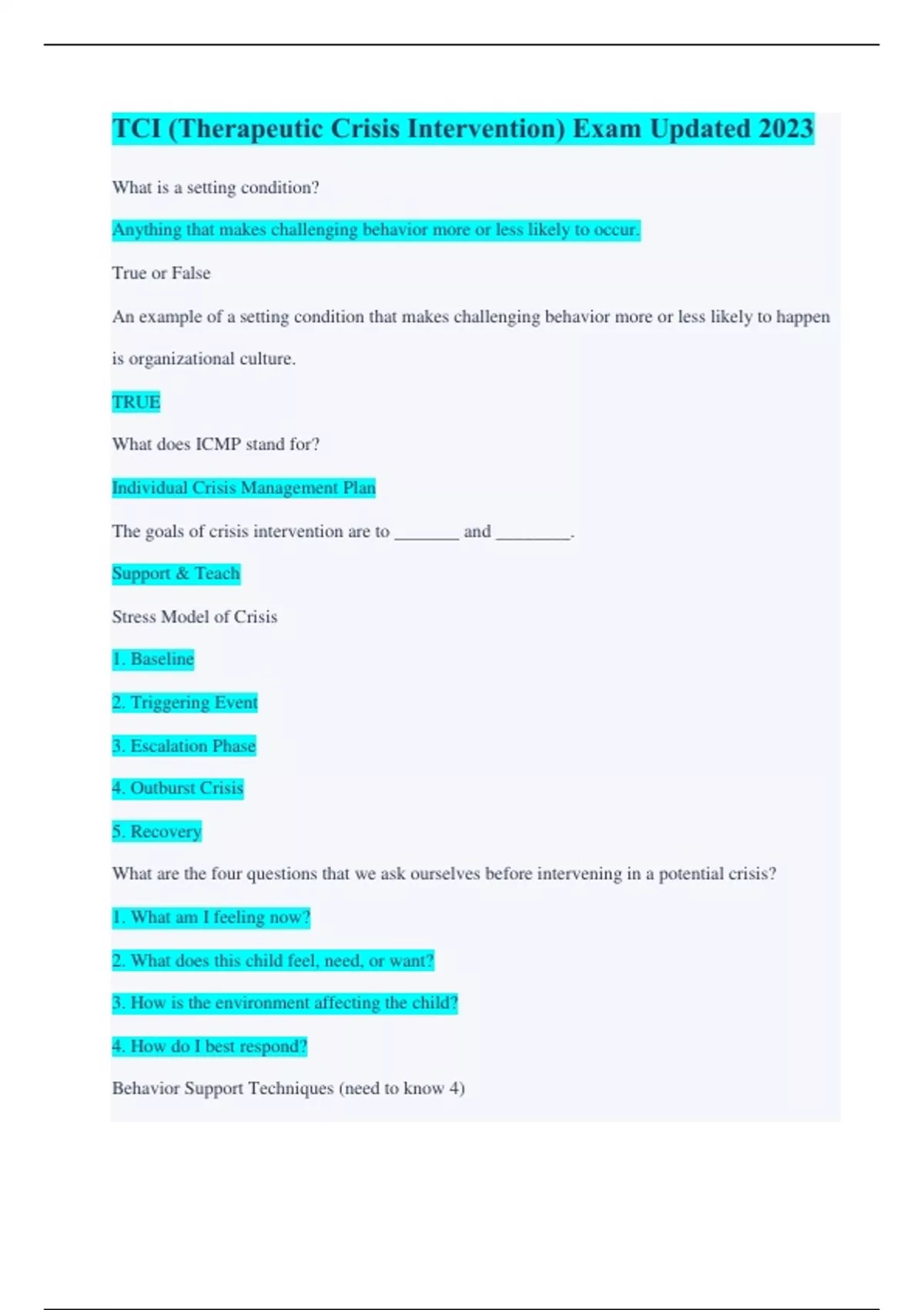 TCI (Therapeutic Crisis Intervention) Exam Updated 2023 What is a setting condition? Anything that makes challenging behavior more or less likely to occur. True or False An example of a setting condition that makes challenging behavior more or less likely to happen is organizational culture. TRUE What does ICMP stand for? Individual Crisis Management Plan The goals of crisis intervention are to _______ and ________. Support & Teach Stress Model of Crisis 1. Baseline 2. Triggering Event 3. Escalation Phase 4. Outburst Crisis 5. Recovery What are the four questions that we ask ourselves before intervening in a potential crisis? 1. What am I feeling now? 2. What does this child feel, need, or want? 3. How is the environment affecting the child? 4. How do I best respond?