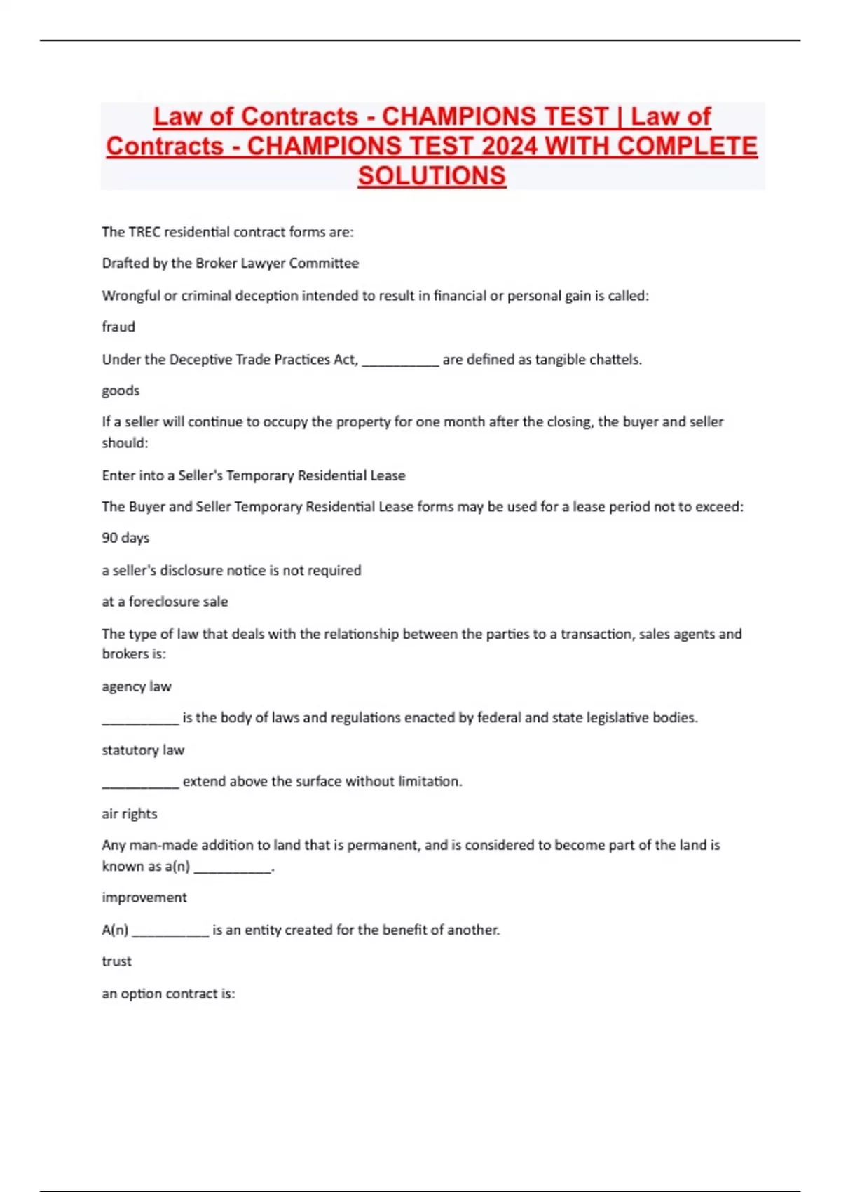 Law of Contracts - CHAMPIONS TEST | Law of Contracts - CHAMPIONS TEST 2024 WITH COMPLETE SOLUTIONS