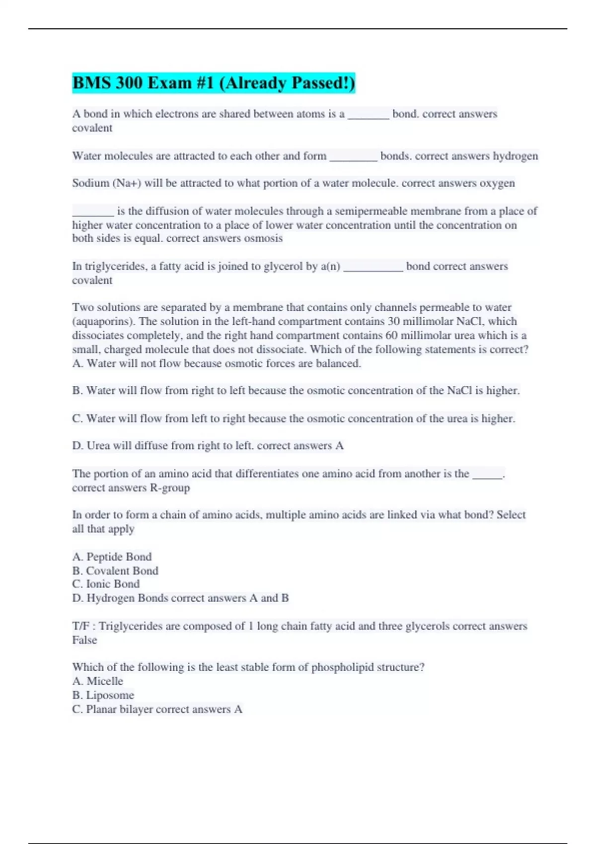 A bond in which electrons are shared between atoms is a _______ bond. correct answers covalent Water molecules are attracted to each other and form ________ bonds. correct answers hydrogen Sodium (Na+) will be attracted to what portion of a water molecule. correct answers oxygen _______ is the diffusion of water molecules through a semipermeable membrane from a place of higher water concentration to a place of lower water concentration until the concentration on both sides is equal. correct answers osmosis In triglycerides, a fatty acid is joined to glycerol by a(n) __________ bond correct answers covalent Two solutions are separated by a membrane that contains only channels permeable to water (aquaporins). The solution in the left-hand compartment contains 30 millimolar NaCl, which dissociates completely, and the right hand compartment contains 60 millimolar urea which is a small, charged molecule that does not dissociate. Which of the following statements is correct? A. Water will not flow because osmotic forces are balanced. B. Water will flow from right to left because the osmotic concentration of the NaCl is higher. C. Water will flow from left to right because the osmotic concentration of the urea is higher. D. Urea will diffuse from right to left. correct answers A The portion of an amino acid that differentiates one amino acid from another is the _____. correct answers R-group In order to form a chain of amino acids, multiple amino acids are linked via what bond? Select all that apply A. Peptide Bond B. Covalent Bond C. Ionic Bond D. Hydrogen Bonds correct answers A and B T/F : Triglycerides are composed of 1 long chain fatty acid and three glycerols correct answers False Which of the following is the least stable form of phospholipid structure? A. Micelle B. Liposome C. Planar bilayer correct answers A