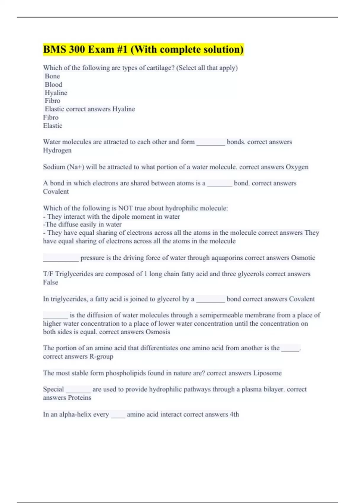 Which of the following are types of cartilage? (Select all that apply) Bone Blood Hyaline Fibro Elastic correct answers Hyaline Fibro Elastic Water molecules are attracted to each other and form ________ bonds. correct answers Hydrogen Sodium (Na+) will be attracted to what portion of a water molecule. correct answers Oxygen A bond in which electrons are shared between atoms is a _______ bond. correct answers Covalent Which of the following is NOT true about hydrophilic molecule: - They interact with the dipole moment in water -The diffuse easily in water - They have equal sharing of electrons across all the atoms in the molecule correct answers They have equal sharing of electrons across all the atoms in the molecule __________ pressure is the driving force of water through aquaporins correct answers Osmotic T/F Triglycerides are composed of 1 long chain fatty acid and three glycerols correct answers False In triglycerides, a fatty acid is joined to glycerol by a ________ bond correct answers Covalent _______ is the diffusion of water molecules through a semipermeable membrane from a place of higher water concentration to a place of lower water concentration until the concentration on both sides is equal. correct answers Osmosis The portion of an amino acid that differentiates one amino acid from another is the _____. correct answers R-group The most stable form phospholipids found in nature are? correct answers Liposome Special _______ are used to provide hydrophilic pathways through a plasma bilayer. correct answers Proteins In an alpha-helix every ____ amino acid interact correct answers 4th