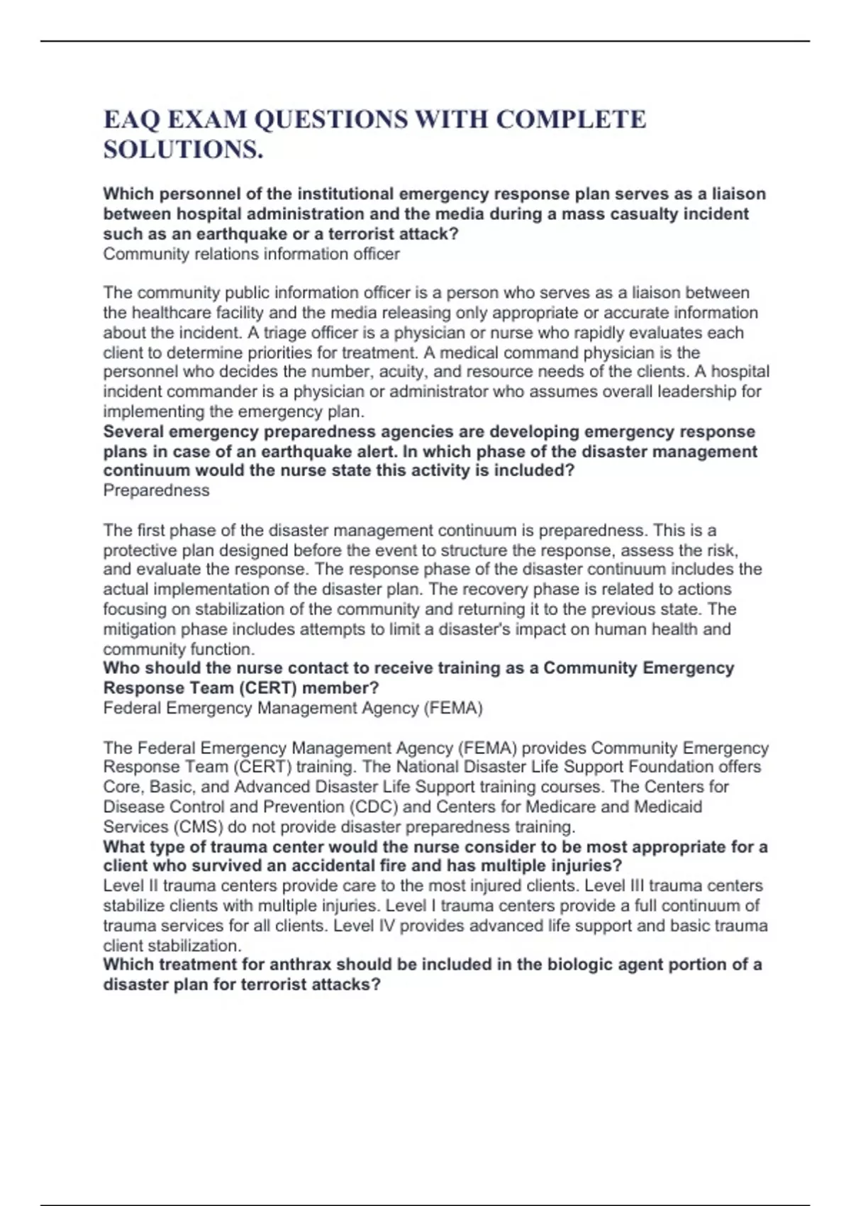 EAQ EXAM QUESTIONS WITH COMPLETE SOLUTIONS. Which personnel of the institutional emergency response plan serves as a liaison between hospital administration and the media during a mass casualty incident such as an earthquake or a terrorist attack? Community relations information officer The community public information officer is a person who serves as a liaison between the healthcare facility and the media releasing only appropriate or accurate information about the incident. A triage officer is a physician or nurse who rapidly evaluates each client to determine priorities for treatment. A medical command physician is the personnel who decides the number, acuity, and resource needs of the clients. A hospital incident commander is a physician or administrator who assumes overall leadership for implementing the emergency plan. Several emergency preparedness agencies are developing emergency response plans in case of an earthquake alert. In which phase of the disaster management continuum would the nurse state this activity is included? Preparedness The first phase of the disaster management continuum is preparedness. This is a protective plan designed before the event to structure the response, assess the risk, and evaluate the response. The response phase of the disaster continuum includes the actual implementation of the disaster plan. The recovery phase is related to actions focusing on stabilization of the community and returning it to the previous state. The mitigation phase includes attempts to limit a disaster's impact on human health and community function. Who should the nurse contact to receive training as a Community Emergency Response Team (CERT) member? Federal Emergency Management Agency (FEMA) The Federal Emergency Management Agency (FEMA) provides Community Emergency Response Team (CERT) training. The National Disaster Life Support Foundation offers Core, Basic, and Advanced Disaster Life Support training courses. The Centers for Disease Control and Prevention (CDC) and Centers for Medicare and Medicaid Services (CMS) do not provide disaster preparedness training. What type of trauma center would the nurse consider to be most appropriate for a client who survived an accidental fire and has multiple injuries? Level II trauma centers provide care to the most injured clients. Level III trauma centers stabilize clients with multiple injuries. Level I trauma centers provide a full continuum of trauma services for all clients. Level IV provides advanced life support and basic trauma client stabilization. Which treatment for anthrax should be included in the biologic agent portion of a disaster plan for terrorist attacks? Antibiotics Anthrax is treated effectively with antibiotics if sufficient supplies are available and the organisms are not resistant. Antivirals would not be effective against anthrax, and there is no established treatment for most viruses that cause hemorrhagic fever. Botulism is treated with antitoxin, though several vaccines are being studied. Smallpox can be prevented or the incidence reduced by vaccination, even when first given after exposure. Advanced Cardiac Life Support (ACLS) certification allows nurses to perform electrical therapies, special resuscitation, and invasive airway management. Basic Life Support(BLS) certification is granted when the nurse performs airway maintenance or cardiopulmonary resuscitation. Certified Emergency Nurse (CEN) certification indicates that a nurse has core emergency nursing skill and knowledge. Pediatric Advanced Life Support (PALS) certification is needed to perform neonatal and pediatric resuscitation. An emergency nursing staff member is performing defibrillation/cardioversion and special resuscitation for clients who sustained injuries in a tsunami. Which certification does the emergency nursing staff member possess? After an earthquake, there were a large number of deaths and casualties who required acute care for several days in the field. Which teams activated by state and federal government authorities would the nurse consider to be the most suitable in managing the event? Select all that apply. Medical Reserve Corps (MRC) Disaster Mortuary Operational Response Teams (DMORTs) The emergency department (ED) charge nurse is preparing a group of medical-surgical and critical care unit nurses for participation in emergency preparedness and response for casualties due to an earthquake in the nearby area. Which actions performed by these staff nurses are appropriate? Select all that apply. Working with ED nurses in the resuscitation setting Recommending which clients are stable for discharge Identifying clients who can be transferred out of the critical care unit What will influence the amount of stress community members might experience after flooding and building damage caused by a Category 4 hurricane? Select all that apply. type of disaster Age of the community members Previous medical and psychologic histories Preexisting mechanisms to cope with disasters Which clients should the medical-surgical nurse identify as appropriate for transfer or discharge to make room for admission of victims of a disaster? Select all that apply. 68-year-old client third post-operative day total knee replacement 80-year-old client being regulated on medication for transient ischemic attacks 72-year-old client beginning oral anticoagulant therapy for a deep vein thrombus Which nurses should be reassigned to assist with acute care of trauma victims coming through the emergency department? Select all that apply Nurse who works in intensive care Nurse who works in the post-anesthesia care unit A nurse working in a disaster management team is caring for clients who suffered severe injuries in a train accident requiring cardiopulmonary resuscitation. Which statements by the nurse are correct? Select all that apply. "A 16-gauge needle should be used to obtain intravenous (IV) access in the antecubital region." Presence of radial pulse indic