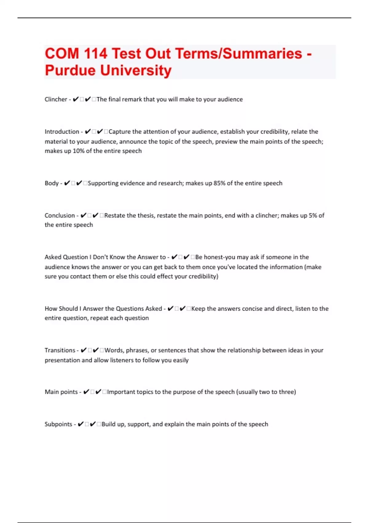 Clincher - ️️The final remark that you will make to your audience Introduction - ️️Capture the attention of your audience, establish your credibility, relate the material to your audience, announce the topic of the speech, preview the main points of the speech; makes up 10% of the entire speech Body - ️️Supporting evidence and research; makes up 85% of the entire speech Conclusion - ️️Restate the thesis, restate the main points, end with a clincher; makes up 5% of the entire speech Asked Question I Don't Know the Answer to - ️️Be honest-you may ask if someone in the audience knows the answer or you can get back to them once you've located the information (make sure you contact them or else this could effect your credibility) How Should I Answer the Questions Asked - ️️Keep the answers concise and direct, listen to the entire question, repeat each question Transitions - ️️Words, phrases, or sentences that show the relationship between ideas in your presentation and allow listeners to follow you easily Main points - ️️Important topics to the purpose of the speech (usually two to three) Subpoints - ️️Build up, support, and explain the main points of the speech
