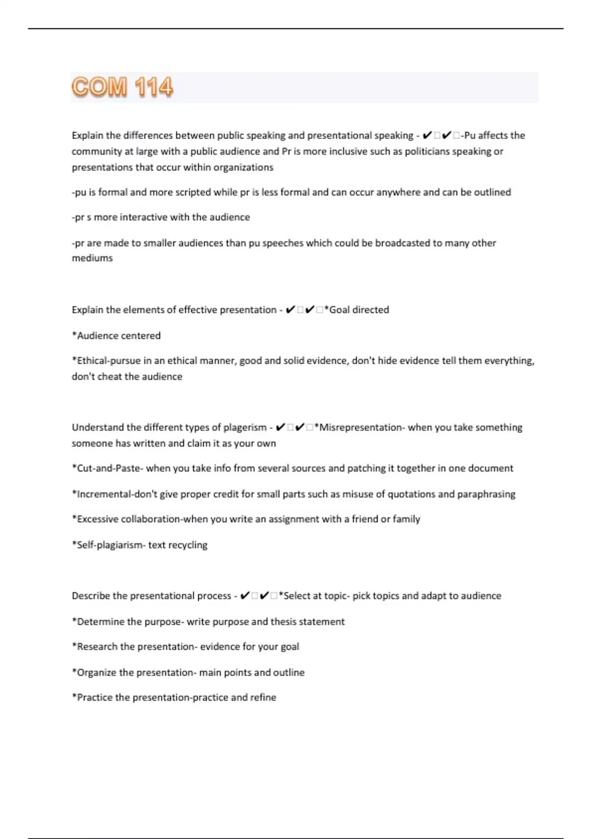 Explain the differences between public speaking and presentational speaking - ️️-Pu affects the community at large with a public audience and Pr is more inclusive such as politicians speaking or presentations that occur within organizations -pu is formal and more scripted while pr is less formal and can occur anywhere and can be outlined -pr s more interactive with the audience -pr are made to smaller audiences than pu speeches which could be broadcasted to many other mediums Explain the elements of effective presentation - ️️*Goal directed *Audience centered *Ethical-pursue in an ethical manner, good and solid evidence, don't hide evidence tell them everything, don't cheat the audience Understand the different types of plagerism - ️️*Misrepresentation- when you take something someone has written and claim it as your own *Cut-and-Paste- when you take info from several sources and patching it together in one document *Incremental-don't give proper credit for small parts such as misuse of quotations and paraphrasing *Excessive collaboration-when you write an assignment with a friend or family *Self-plagiarism- text recycling Describe the presentational process - ️️*Select at topic- pick topics and adapt to audience *Determine the purpose- write purpose and thesis statement *Research the presentation- evidence for your goal *Organize the presentation- main points and outline *Practice the presentation-practice and refine