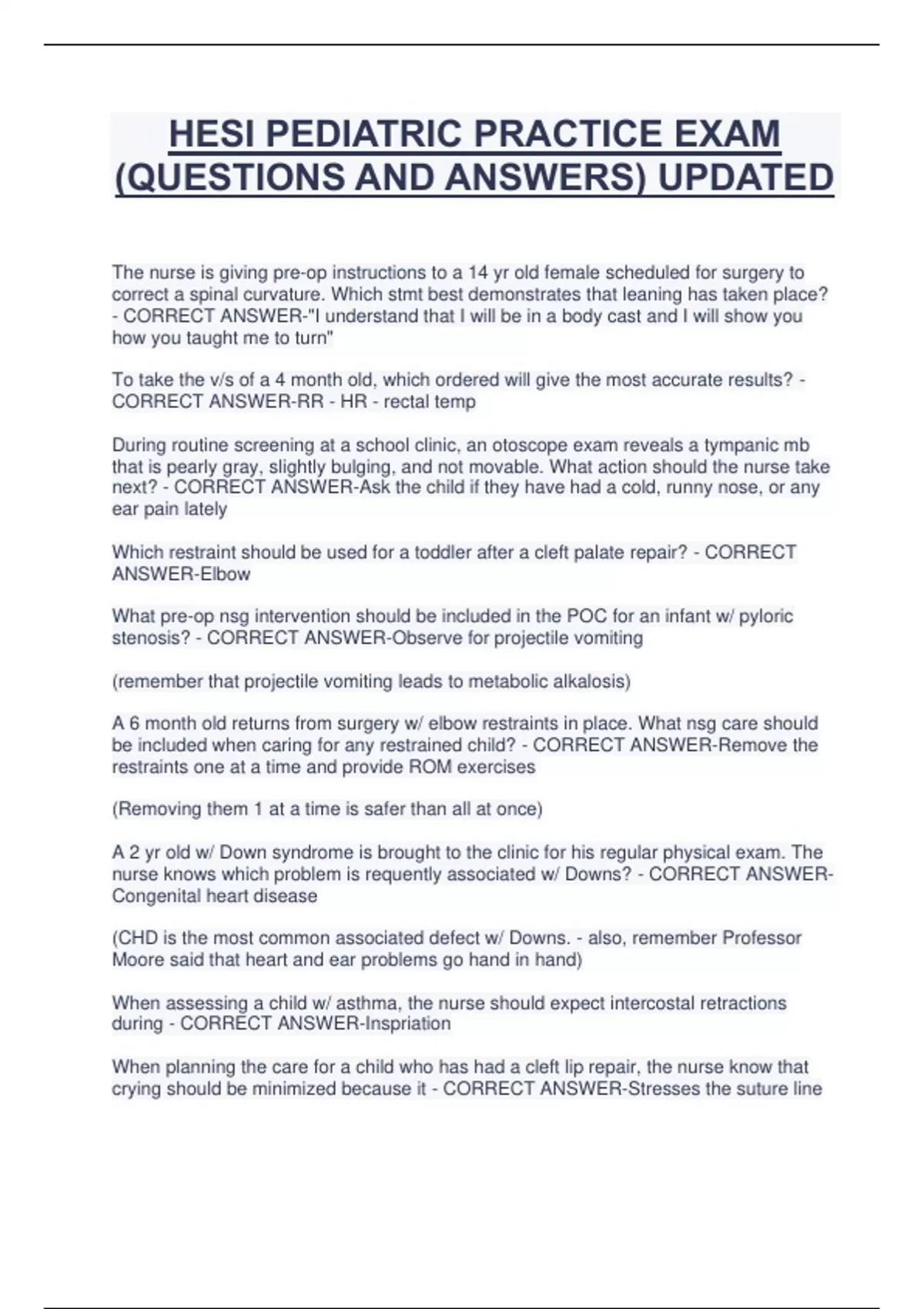 HESI PEDIATRIC PRACTICE EXAM (QUESTIONS AND ANSWERS) UPDATED The nurse is giving pre-op instructions to a 14 yr old female scheduled for surgery to correct a spinal curvature. Which stmt best demonstrates that leaning has taken place? - CORRECT ANSWER-"I understand that I will be in a body cast and I will show you how you taught me to turn" To take the v/s of a 4 month old, which ordered will give the most accurate results? - CORRECT ANSWER-RR - HR - rectal temp During routine screening at a school clinic, an otoscope exam reveals a tympanic mb that is pearly gray, slightly bulging, and not movable. What action should the nurse take next? - CORRECT ANSWER-Ask the child if they have had a cold, runny nose, or any ear pain lately Which restraint should be used for a toddler after a cleft palate repair? - CORRECT ANSWER-Elbow What pre-op nsg intervention should be included in the POC for an infant w/ pyloric stenosis? - CORRECT ANSWER-Observe for projectile vomiting (remember that projectile vomiting leads to metabolic alkalosis) A 6 month old returns from surgery w/ elbow restraints in place. What nsg care should be included when caring for any restrained child? - CORRECT ANSWER-Remove the restraints one at a time and provide ROM exercises (Removing them 1 at a time is safer than all at once) A 2 yr old w/ Down syndrome is brought to the clinic for his regular physical exam. The nurse knows which problem is requently associated w/ Downs? - CORRECT ANSWERCongenital heart disease (CHD is the most common associated defect w/ Downs. - also, remember Professor Moore said that heart and ear problems go hand in hand) When assessing a child w/ asthma, the nurse should expect intercostal retractions during - CORRECT ANSWER-Inspriation When planning the care for a child who has had a cleft lip repair, the nurse know that crying should be minimized because it - CORRECT ANSWER-Stresses the suture line A full-term infant is admitted to the newborn nursery. After careful assessment, the nurse suspects that the infant may have an esophageal atresia. Which sx's is this newborn likely to have exhibited? - CORRECT ANSWER-Choking , coughing, and cyanosis (this answer includes the 3 "C"s of esophageal atresia caused by the overflow of secretions to the trachea) Which behavior would the nurse expect a 2 yr old to exhibit? - CORRECT ANSWERDisplay possessiveness of toys (they are egocentric and unable to share w/ others) the other of a preschool-aged child asks the nurse if it is all right to administer Pepto Bismol to her son when he has a tummy ache. After reminding her to check the label of all OTC meds for the presence of ASA, which instruction should the nurse include when replying to the mom's question? - CORRECT ANSWER-Do not give if they have chicken pox, the flue, or any other viral illness (ASA can cause Reye's syndrome) the nurse observes a 4 yr old boy in a daycare. Which behavior should the nurse consider normal for this child? - CORRECT ANSWER-Demonstrates aggressiveness by boasting when telling a story A burned child is brought to the ER. In estimating the % of body burned, the nurse uses a modified "Rule of Nines." Which part of the body is calculated as a larger % of total body surface than an adult? - CORRECT ANSWER-Head and neck (a child's head and neck are proportionately larger to their body than an adult's) The nurse receives a lab report stating a child w/ asthma has a theophylline level of 15mcg/dL. What action will the nurse take? - CORRECT ANSWER-Pass the info on in the report (therapeutic level is 10-20) A 12 month old is admitted w/ a respiratory infection and possible pneumonia. He is placed in a mist tent w/ O2. Which nsg intervention has the greatest priority? - CORRECT ANSWER-Have a bulb syringe readily available to remove secretions (patent airway has the highest priority. Humidification will liquefy the nasal secretions - thereby increasing the amt of secretions and making that a priority)