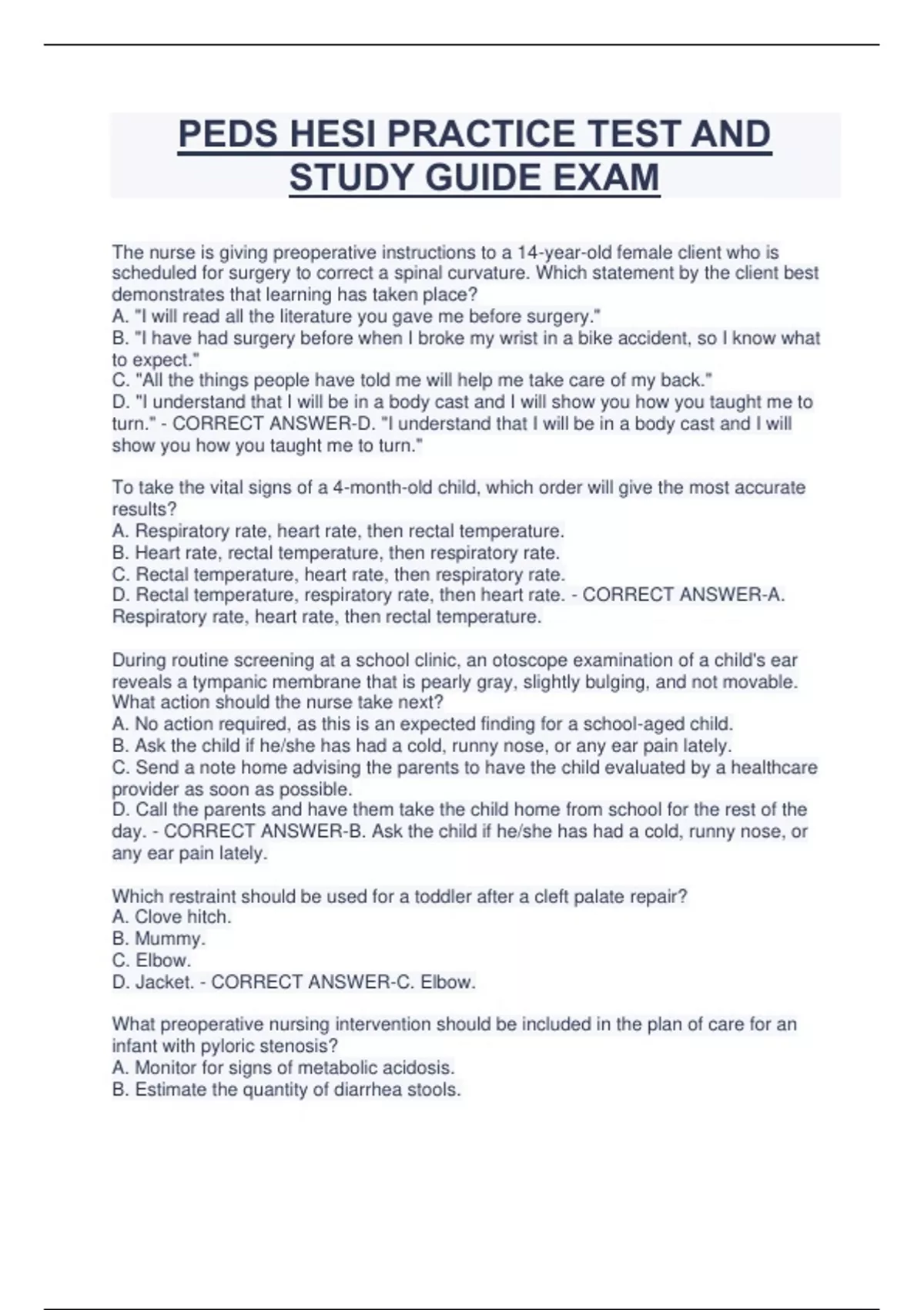 PEDS HESI PRACTICE TEST AND STUDY GUIDE EXAM The nurse is giving preoperative instructions to a 14-year-old female client who is scheduled for surgery to correct a spinal curvature. Which statement by the client best demonstrates that learning has taken place? A. "I will read all the literature you gave me before surgery." B. "I have had surgery before when I broke my wrist in a bike accident, so I know what to expect." C. "All the things people have told me will help me take care of my back." D. "I understand that I will be in a body cast and I will show you how you taught me to turn." - CORRECT ANSWER-D. "I understand that I will be in a body cast and I will show you how you taught me to turn." To take the vital signs of a 4-month-old child, which order will give the most accurate results? A. Respiratory rate, heart rate, then rectal temperature. B. Heart rate, rectal temperature, then respiratory rate. C. Rectal temperature, heart rate, then respiratory rate. D. Rectal temperature, respiratory rate, then heart rate. - CORRECT ANSWER-A. Respiratory rate, heart rate, then rectal temperature. During routine screening at a school clinic, an otoscope examination of a child's ear reveals a tympanic membrane that is pearly gray, slightly bulging, and not movable. What action should the nurse take next? A. No action required, as this is an expected finding for a school-aged child. B. Ask the child if he/she has had a cold, runny nose, or any ear pain lately. C. Send a note home advising the parents to have the child evaluated by a healthcare provider as soon as possible. D. Call the parents and have them take the child home from school for the rest of the day. - CORRECT ANSWER-B. Ask the child if he/she has had a cold, runny nose, or any ear pain lately. Which restraint should be used for a toddler after a cleft palate repair? A. Clove hitch. B. Mummy. C. Elbow. D. Jacket. - CORRECT ANSWER-C. Elbow. What preoperative nursing intervention should be included in the plan of care for an infant with pyloric stenosis? A. Monitor for signs of metabolic acidosis. B. Estimate the quantity of diarrhea stools. C. Place in a supine position after feeding. D. Observe for projectile vomiting. - CORRECT ANSWER-D. Observe for projectile vomiting. A six-month-old returns from surgery with elbow restraints in place. What nursing care should be included when caring for any restrained child? A. Keep restraints on at all times. B. Remove restraints one at a time and provide range of motion exercises. C. Remove all restraints simultaneously and provide play activities. D. Renew the healthcare provider's prescription for restraints every 72 hours. - CORRECT ANSWER-B. Remove restraints one at a time and provide range of motion exercises. A 2-year-old child with Down syndrome is brought to the clinic for his regular physical examination. The nurse knows which problem is frequently associated with Down syndrome? A. Congenital heart disease. B. Fragile X chromosome. C. Trisomy 13. D. Pyloric stenosis. - CORRECT ANSWER-A. Congenital heart disease. When assessing a child with asthma, the nurse should expect intercostal retractions during A. Inspiration. B. Coughing. C. Apneic episodes. D. Expiration. - CORRECT ANSWER-A. Inspiration. When planning the care for a child who has had a cleft lip repair, the nurse knows that crying should be minimized because it A. Increases salivation. B. Increases the respiratory rate. C. Leads to vomiting. D. Stresses the suture line. - CORRECT ANSWER-D. Stresses the suture line. A full-term infant is admitted to the newborn nursery. After careful assessment, the nurse suspects that the infant may have an esophageal atresia. Which symptoms is this newborn likely to have exhibited? A. Choking, coughing, and cyanosis. B. Projectile vomiting and cyanosis. C. Apneic spells and grunting. D. Scaphoid abdomen and anorexia. - CORRECT ANSWER-A. Choking, coughing, and cyanosis. Which behavior would the nurse expect a two-year-old child to exhibit? A. Build a house with blocks