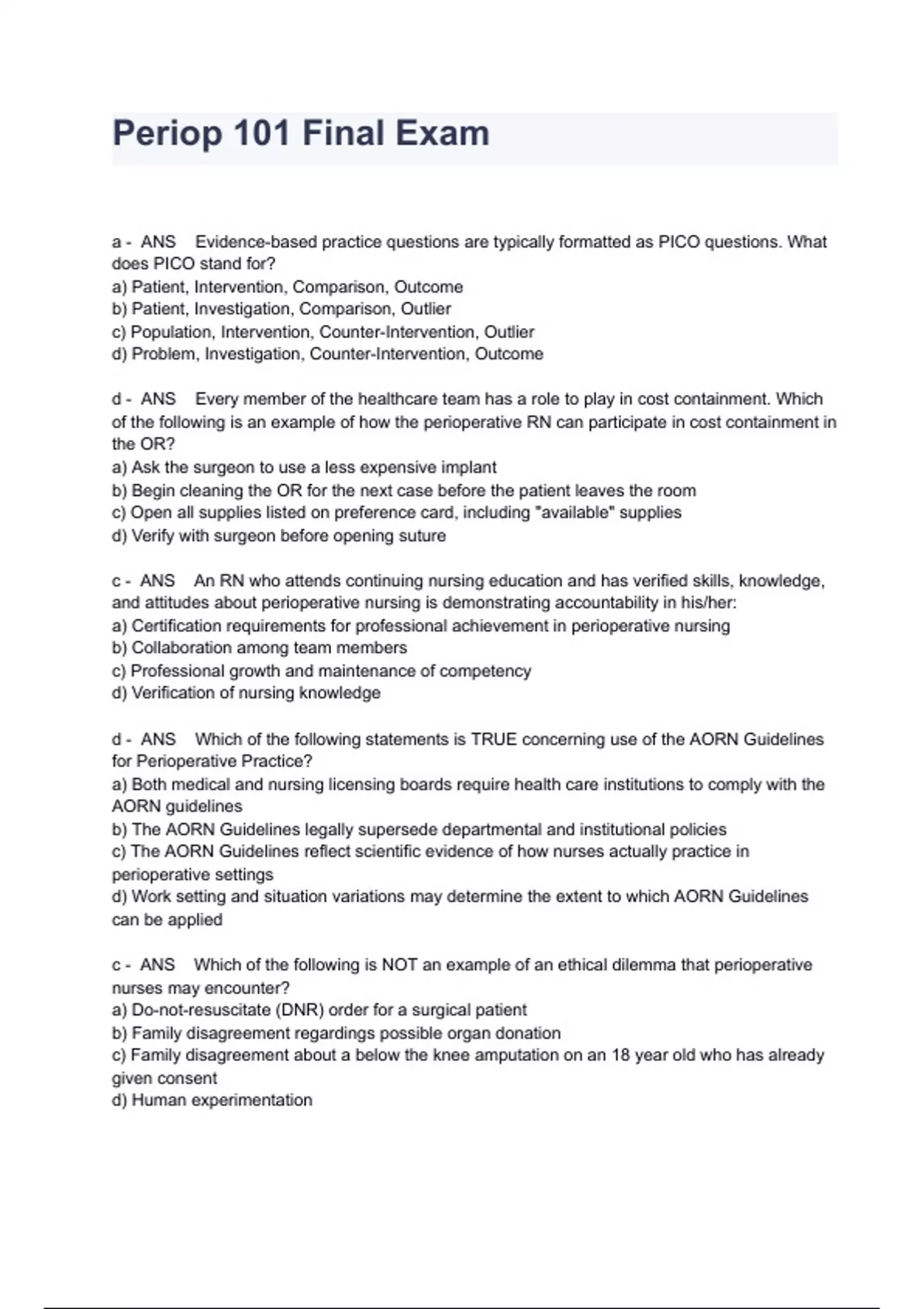 Periop 101 Final Exam Questions With Verified Answers a - ANS Evidence-based practice questions are typically formatted as PICO questions. What does PICO stand for? a) Patient, Intervention, Comparison, Outcome b) Patient, Investigation, Comparison, Outlier c) Population, Intervention, Counter-Intervention, Outlier d) Problem, Investigation, Counter-Intervention, Outcome d - ANS Every member of the healthcare team has a role to play in cost containment. Which of the following is an example of how the perioperative RN can participate in cost containment in the OR? a) Ask the surgeon to use a less expensive implant b) Begin cleaning the OR for the next case before the patient leaves the room c) Open all supplies listed on preference card, including "available" supplies d) Verify with surgeon before opening suture c - ANS An RN who attends continuing nursing education and has verified skills, knowledge, and attitudes about perioperative nursing is demonstrating accountability in his/her: a) Certification requirements for professional achievement in perioperative nursing b) Collaboration among team members c) Professional growth and maintenance of competency d) Verification of nursing knowledge d - ANS Which of the following statements is TRUE concerning use of the AORN Guidelines for Perioperative Practice? a) Both medical and nursing licensing boards require health care institutions to comply with the AORN guidelines b) The AORN Guidelines legally supersede departmental and institutional policies c) The AORN Guidelines reflect scientific evidence of how nurses actually practice in perioperative settings d) Work setting and situation variations may determine the extent to which AORN Guidelines can be applied c - ANS Which of the following is NOT an example of an ethical dilemma that perioperative nurses may encounter? a) Do-not-resuscitate (DNR) order for a surgical patient b) Family disagreement regardings possible organ donation c) Family disagreement about a below the knee amputation on an 18 year old who has already given consent d) Human experimentation b - ANS The phrase "At least one individual failed to do what a similarly situated, reasonable, and prudent professional would have done under similar circumstances" is the definition of: a) Abandonment b) Negligence c) Unethical behavior d) Malpractice d - ANS All of the following are accurate descriptions of "professional accountability" EXCEPT: a) Becoming certified in your specialty b) Collaborating with peers in selecting the right instruments and right equipment for each patient c) Pursuing a higher academic degree d) Relying ONLY on peer evaluations e) Staying current with changes in your specialty b - ANS Part of the AORN standards of Professional Practice mandate that nurses evaluate the quality of their nursing practice. Four ways to ensure professional practice related to the AORN practice include: maintaining competency, the use of evidence-based practice, certification, and: a) Mentoring student nurses b) Pursuit of lifelong learning c) Achieving a minimum of an associate's degree d) Achievement of an advanced practice nurse degree c - ANS After transferring a male patient into the Phase I PACU, the perioperative RN could reasonably expect the PACU RN to FIRST: a) Administer medication to the patient for nausea and vomiting b) Ask the patient is he has any pain c) Assess the patient's airway and respirations d) Care for this patient and two other patients as assigned b - ANS During a handover report to the PACU RN, the perioperative RN may use a communication method identified by the acronym "SBAR." What does SBAR stand for? a) Safety, Background, Actions, Recovery expectations b) Situation, Background, Assessment, Recommendation c) Safety concerns, Background, Assessment, Responsibility d) Surgeon, Background, Assessment, Recovery time c - ANS A 40-year-old male patient is awake and alert in the post anesthesia care unit after right shoulder surgery. What is the BEST measure to assess the patient's pain? a) Discuss the patient's pain with a close family member b) Observe facial expressions and behaviors c) Ask patient to describe his pain or use a standardized pain scale d) Monitor vital sign changes d - ANS What would be the MOST important information for a nurse in Preadmission Testing (PAT) to collect on an insulin dependent diabetic patient? a) How long the patient has been diabetic b) If there is someone to drive them home c) The last time the patient ate or drank d) The type of insulin the patient takes c - ANS The Perianesthesia nurse has A