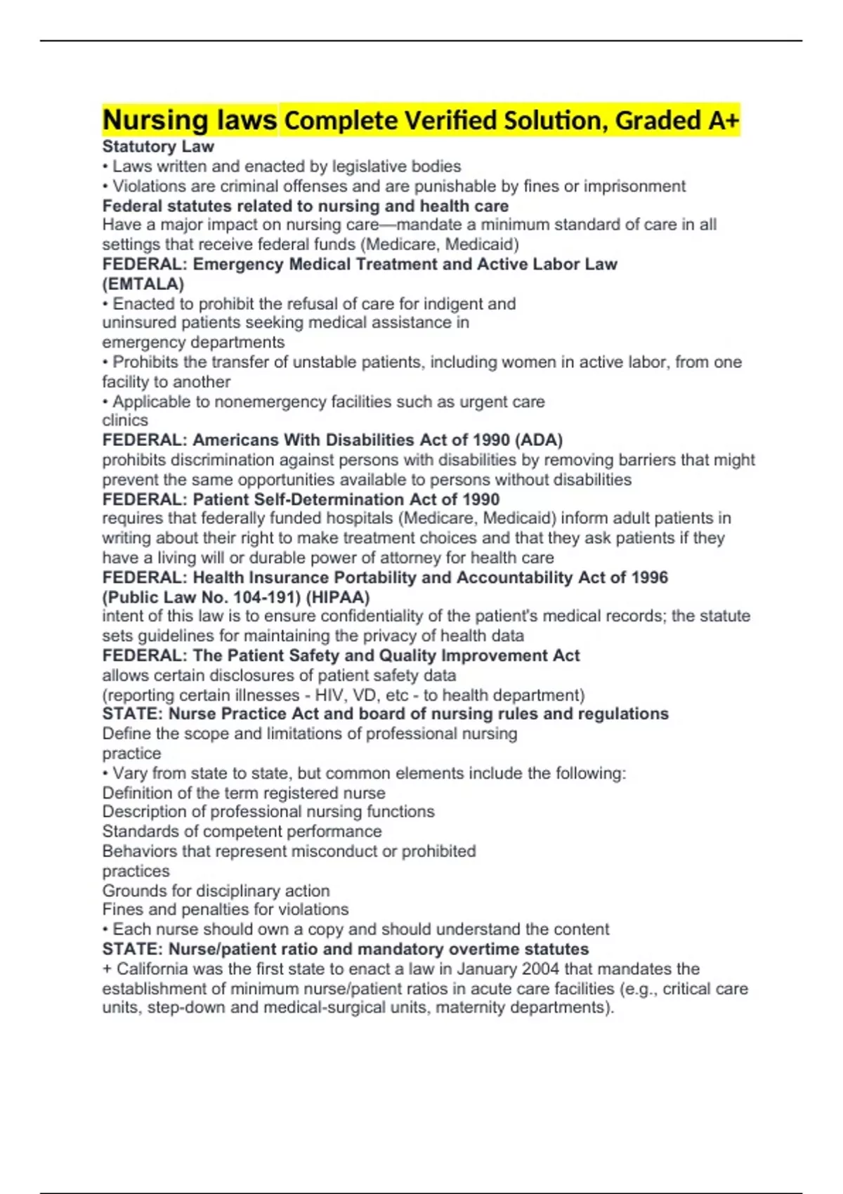 Nursing laws Complete Verified Solution, Graded A+ Statutory Law • Laws written and enacted by legislative bodies • Violations are criminal offenses and are punishable by fines or imprisonment Federal statutes related to nursing and health care Have a major impact on nursing care—mandate a minimum standard of care in all settings that receive federal funds (Medicare, Medicaid) FEDERAL: Emergency Medical Treatment and Active Labor Law (EMTALA) • Enacted to prohibit the refusal of care for indigent and uninsured patients seeking medical assistance in emergency departments • Prohibits the transfer of unstable patients, including women in active labor, from one facility to another • Applicable to nonemergency facilities such as urgent care clinics FEDERAL: Americans With Disabilities Act of 1990 (ADA) prohibits discrimination against persons with disabilities by removing barriers that might prevent the same opportunities available to persons without disabilities FEDERAL: Patient Self-Determination Act of 1990 requires that federally funded hospitals (Medicare, Medicaid) inform adult patients in writing about their right to make treatment choices and that they ask patients if they have a living will or durable power of attorney for health care FEDERAL: Health Insurance Portability and Accountability Act of 1996 (Public Law No. 104-191) (HIPAA) intent of this law is to ensure confidentiality of the patient's medical records; the statute sets guidelines for maintaining the privacy of health data FEDERAL: The Patient Safety and Quality Improvement Act allows certain disclosures of patient safety data (reporting certain illnesses - HIV, VD, etc - to health department) STATE: Nurse Practice Act and board of nursing rules and regulations Define the scope and limitations of professional nursing practice • Vary from state to state, but common elements include the following: Definition of the term registered nurse Description of professional nursing functions Standards of competent performance Behaviors that represent misconduct or prohibited practices Grounds for disciplinary action Fines and penalties for violations • Each nurse should own a copy and should understand the content STATE: Nurse/patient ratio and mandatory overtime statutes + California was the first state to enact a law in January 2004 that mandates the establishment of minimum nurse/patient ratios in acute care facilities (e.g., critical care units, step-down and medical-surgical units, maternity departments).