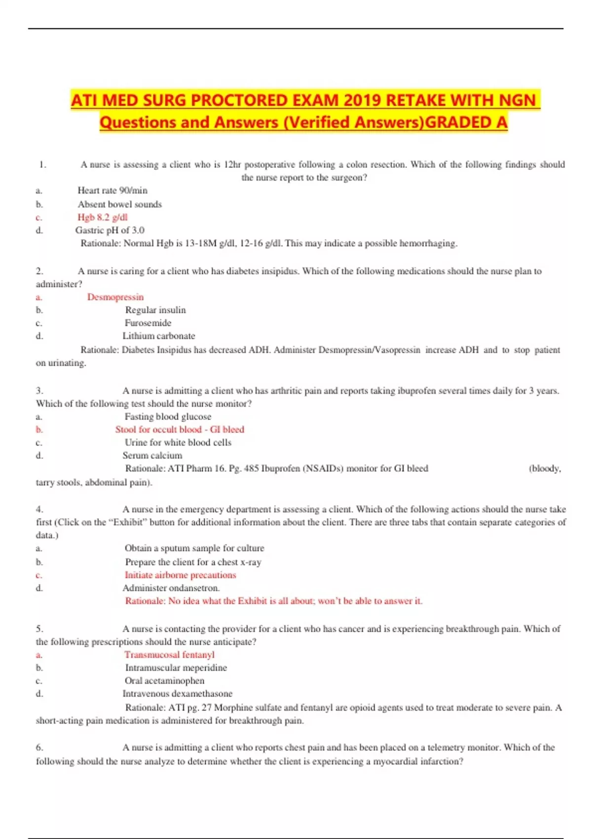 ATI MED SURG PROCTORED EXAM 2019 RETAKE WITH NGN Questions and Answers (Verified Answers)GRADED A 1. A nurse is assessing a client who is 12hr postoperative following a colon resection. Which of the following findings should the nurse report to the surgeon? a. Heart rate 90/min b. Absent bowel sounds c. Hgb 8.2 g/dl d. Gastric pH of 3.0 Rationale: Normal Hgb is 13-18M g/dl, 12-16 g/dl. This may indicate a possible hemorrhaging. 2. A nurse is caring for a client who has diabetes insipidus. Which of the following medications should the nurse plan to administer? a. Desmopressin b. Regular insulin c. Furosemide d. Lithium carbonate Rationale: Diabetes Insipidus has decreased ADH. Administer Desmopressin/Vasopressin increase ADH and to stop patient on urinating. 3. A nurse is admitting a client who has arthritic pain and reports taking ibuprofen several times daily for 3 years. Which of the following test should the nurse monitor? a. Fasting blood glucose b. Stool for occult blood - GI bleed c. Urine for white blood cells d. Serum calcium Rationale: ATI Pharm 16. Pg. 485 Ibuprofen (NSAIDs) monitor for GI bleed (bloody, tarry stools, abdominal pain). 4. A nurse in the emergency department is assessing a client. Which of the following actions should the nurse take first (Click on the “Exhibit” button for additional information about the client. There are three tabs that contain separate categories of data.) a. Obtain a sputum sample for culture b. Prepare the client for a chest x-ray c. Initiate airborne precautions d. Administer ondansetron. Rationale: No idea what the Exhibit is all about; won’t be able to answer it. 5. A nurse is contacting the provider for a client who has cancer and is experiencing breakthrough pain. Which of the following prescriptions should the nurse anticipate? a. Transmucosal fentanyl b. Intramuscular meperidine c. Oral acetaminophen d. Intravenous dexamethasone Rationale: ATI pg. 27 Morphine sulfate and fentanyl are opioid agents used to treat moderate to severe pain. A short-acting pain medication is administered for breakthrough pain. 6. A nurse is admitting a client who reports chest pain and has been placed on a telemetry monitor. Which of the following should the nurse analyze to determine whether the client is experiencing a myocardial infarction? a. PR interval b. QRS duration c. T wave d. ST segment Rationale: ST elevation indicates MI. ST depression indicates ischemia